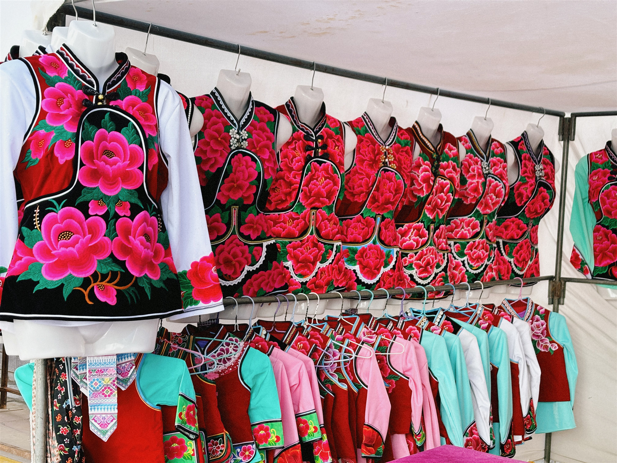 服饰区也是市场的一大亮点。这里不仅有各式各样的日常款衣服、鞋子,还有精美的彝族服饰,色彩艳丽,制作精细,让人眼前一亮。