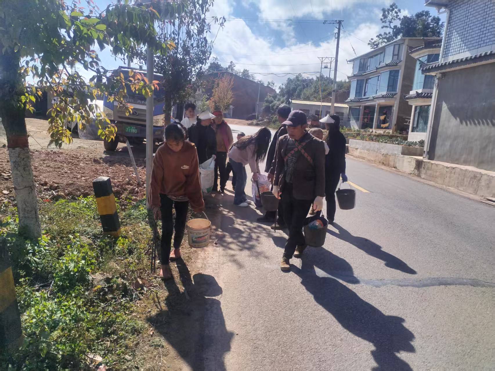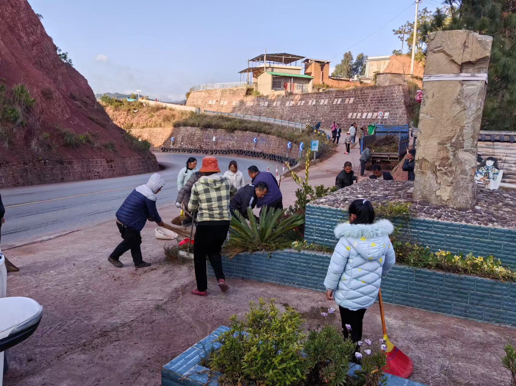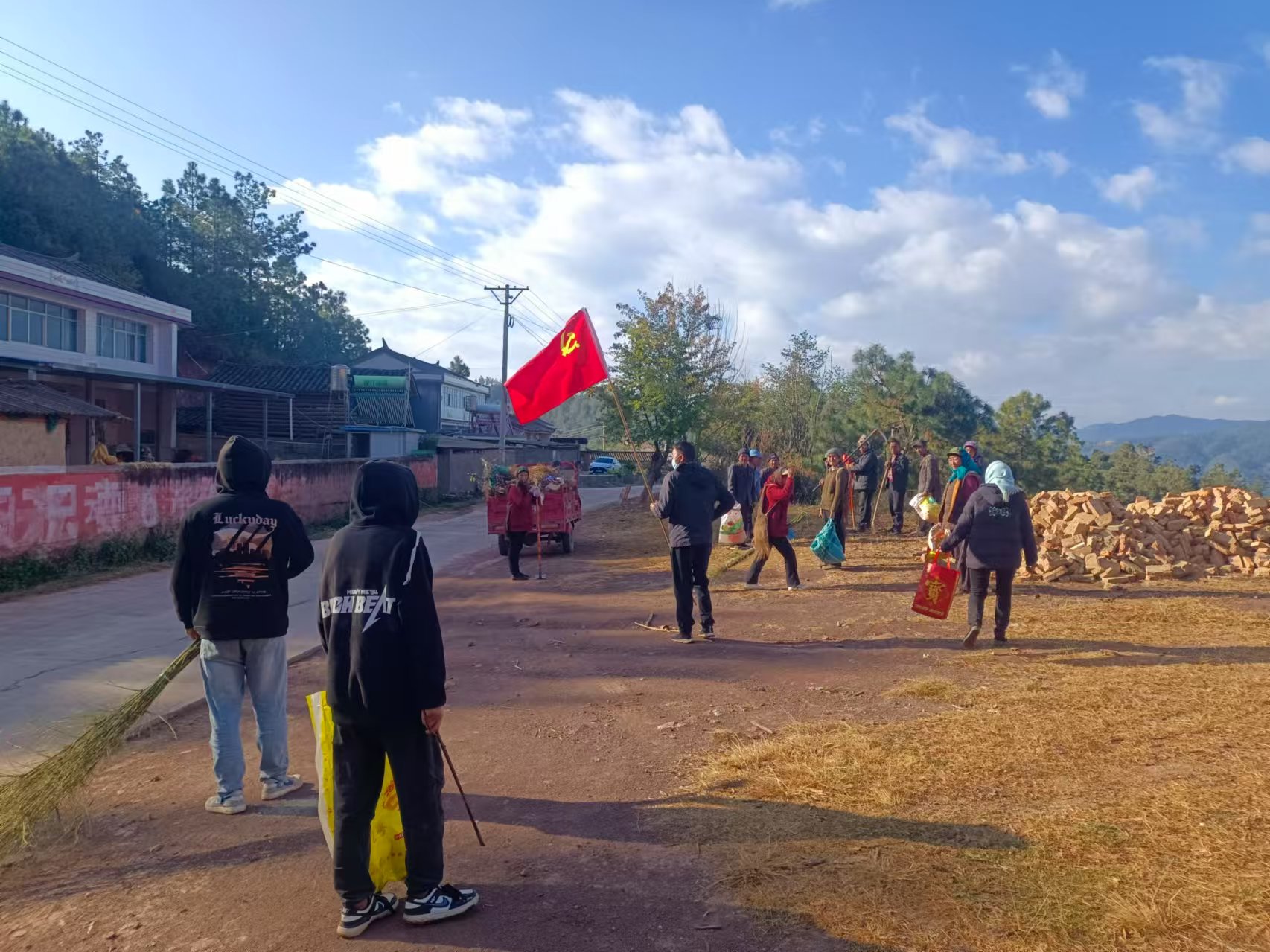 在五街镇石板河村委会,温暖的阳光洒在村庄的每一个角落,志愿者和村民们带着扫帚、铁锹等工具,背上小娃娃,带上大娃娃,走出家门打扫卫生,脸上洋溢着对新年的期待和对美好家园的热爱。“这段时间孩子也放假了,刚好带着他们一起来打扫卫生,从娃娃抓起,树立保护村庄环境的理念,共筑美好家园。”石板河村党总支副书记罗丽伟说。