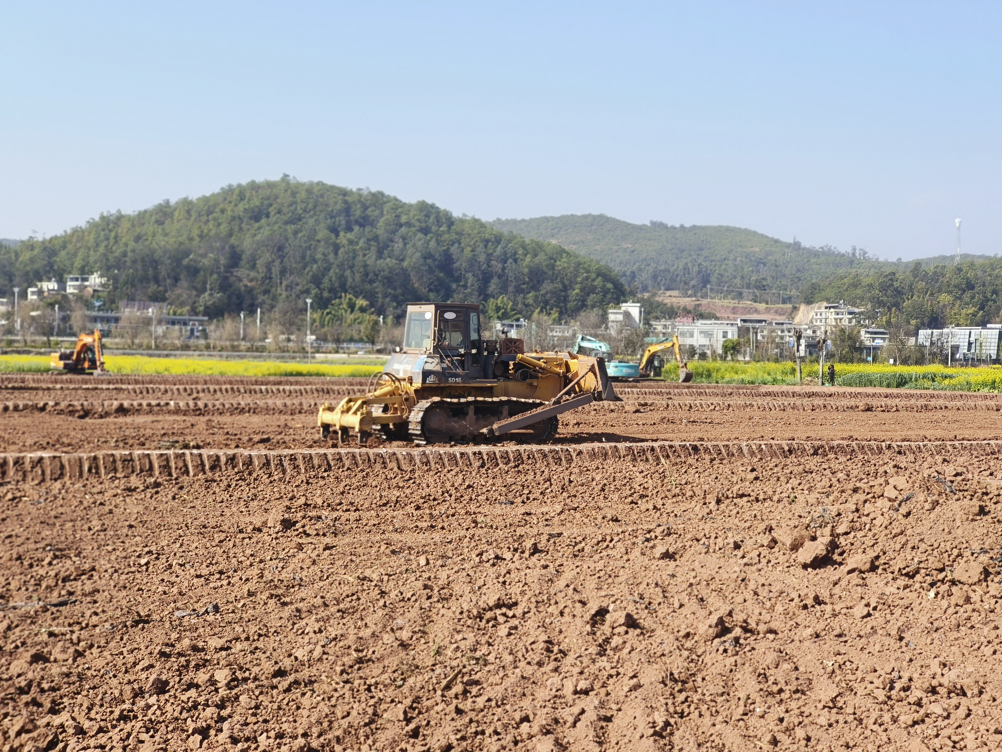 “轰隆轰隆……”“滋滋滋……”走进南华县龙川镇平山社区周官冲上村小组,只见10余台挖掘机、推土机、切割机在田里有条不紊的作业着。切割声、焊接声、锤打声与暖暖的春风交相呼应,呈现出一片争分夺秒、抢抓施工的热烈场景。