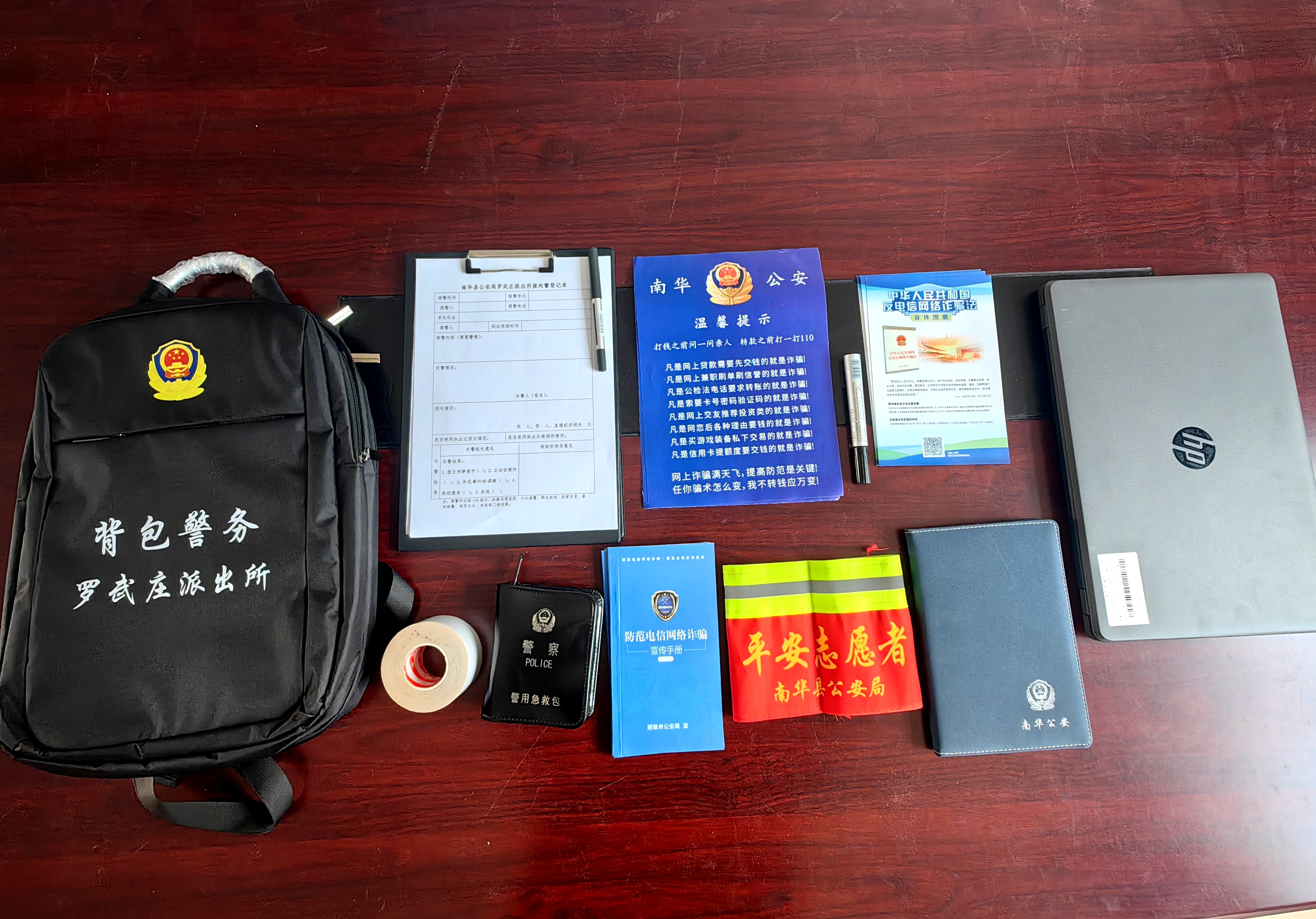 一台笔记本电脑、一台照相机、一个急救包、一支笔、一本记事本、一摞宣传资料、一张警民联系卡、一本法律法规书……一个背包就是一个服务窗口。