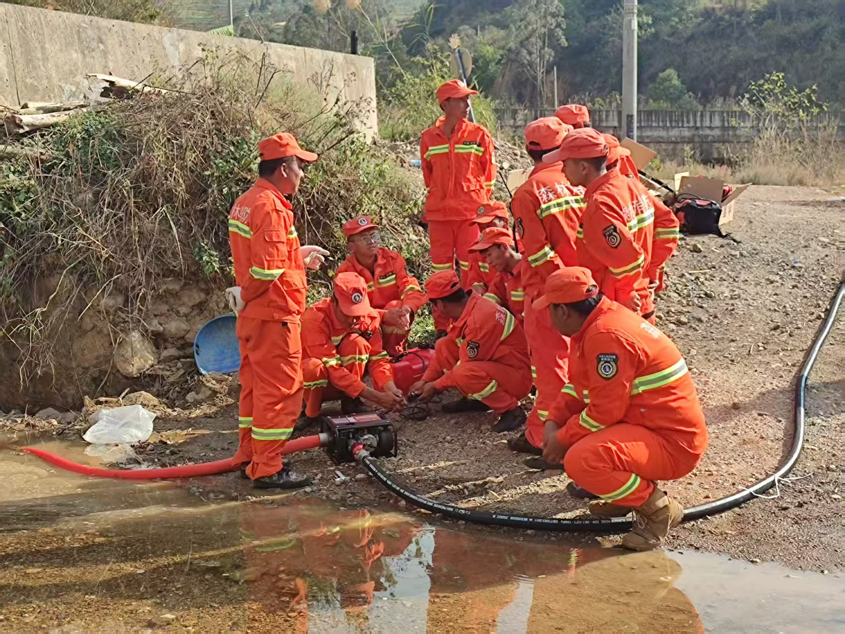 演练以提升全镇森林防灭火应急处置能力为目标,出动消防灭火车1辆、水泵2台、风力灭火机10台,15名专职消防员在镇指挥中心的统一指挥调度下,根据预设的模拟火情进行演练,相关人员围绕紧急拉动、带装行进、灭火扑救、零火处置等核心环节紧张有序展开演练,过程中,消防员们分工明确、配合默契,整个环节紧张有序,达到了预期效果。