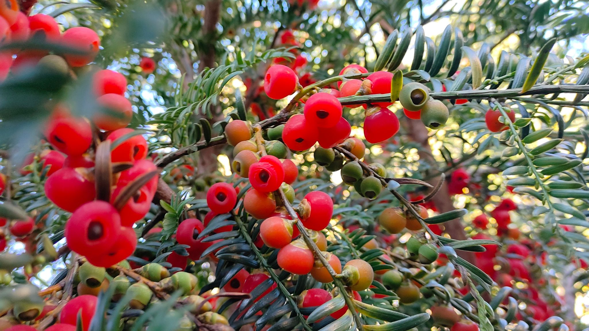 深入林间时,就会发现大风垭口除了让人震撼的绿色外,还藏着些许红色,这红色就是国家一级保护植物红豆杉,它被誉为“植物活化石”,树干挺拔,枝叶苍翠,每一道年轮都记录着一街山川的变迁。红豆杉枝叶四季常青,而到了秋冬时节,镶嵌于绿叶丛中的红豆便全都探出了脑袋,如珊瑚、似玛瑙,成为了万绿丛中星星点点的红,默默地向人们展示着一街生态环境的纯净。