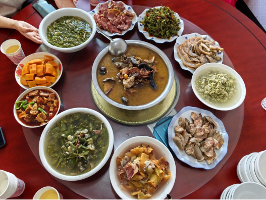 山野珍馐蕴春味。凛冬已过,湿润的江风裹着泥土芬芳,野菜开始舒展蜷曲的嫩芽,鲜嫩的龙爪菜、刺白花、刺头菜……一丛丛、一串串,静待人们的采摘。采野菜的大姐腰系竹篓,手指翻飞,“刺头菜焯水凉拌,豆米苦刺花汤最香。”她们遵循“采三留七”的古训,让春意在丛林中尽情舞动。农家院里,腊肉与野菜在柴火灶上烹煮。长辈们边翻炒边念叨,“春菜吃的就是个‘野’字,这可是咱们红土坡祖祖辈辈传下来的美食经。”