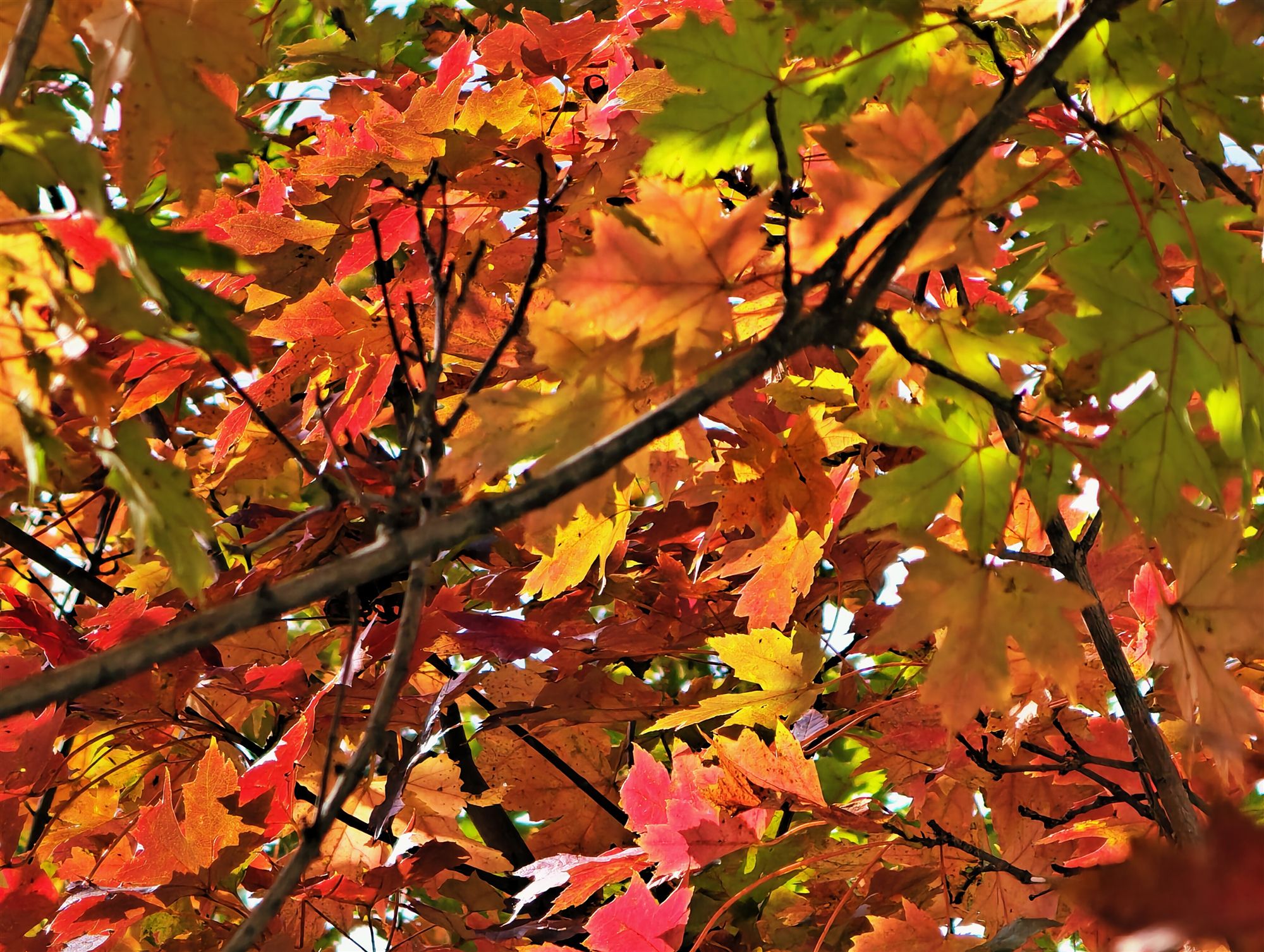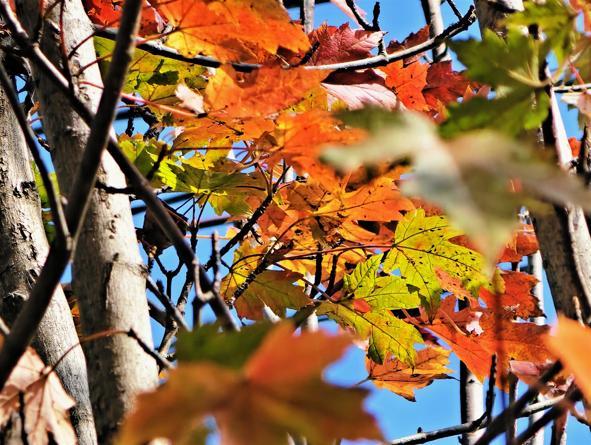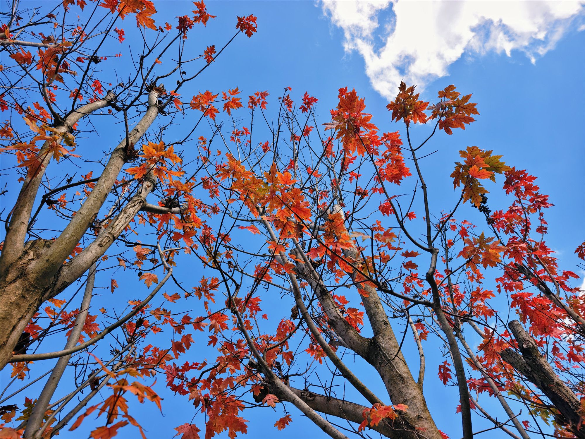 最惊艳是那色彩的盛宴——向阳处是炽烈的朱红,背光处沉淀为醇厚的绛紫,而那些将落未落的,边缘已镶上灿金,像是岁月留下的温柔吻痕。风起时,它们不再仅仅是飘零,而是以优雅的弧线完成与枝梢最后的舞蹈,旋落间在地上铺就斑斓的织锦。这沙沙的脆响,是秋天最动听的絮语。