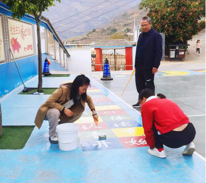 面对教学任务与教育创新的双重挑战,红土坡镇的教师们以巧思破题,用油漆、彩粉为“画笔”,将学科知识与红色文化融入游戏设计。精心设计绘制了“萝卜蹲”“重走长征路”“乘法口诀”“声母韵母表”“26个英文字母”等10余种游戏图案,教师们精打细算,从设计到实施,始终秉持“环保节约、实用育人”原则,选用经济环保材料,仅用基础涂料便完成创作,既避免高昂成本,又确保安全美观。青年教师董老师坦言,“虽然加班绘制很累,但看到孩子们的笑脸,一切都值得。”