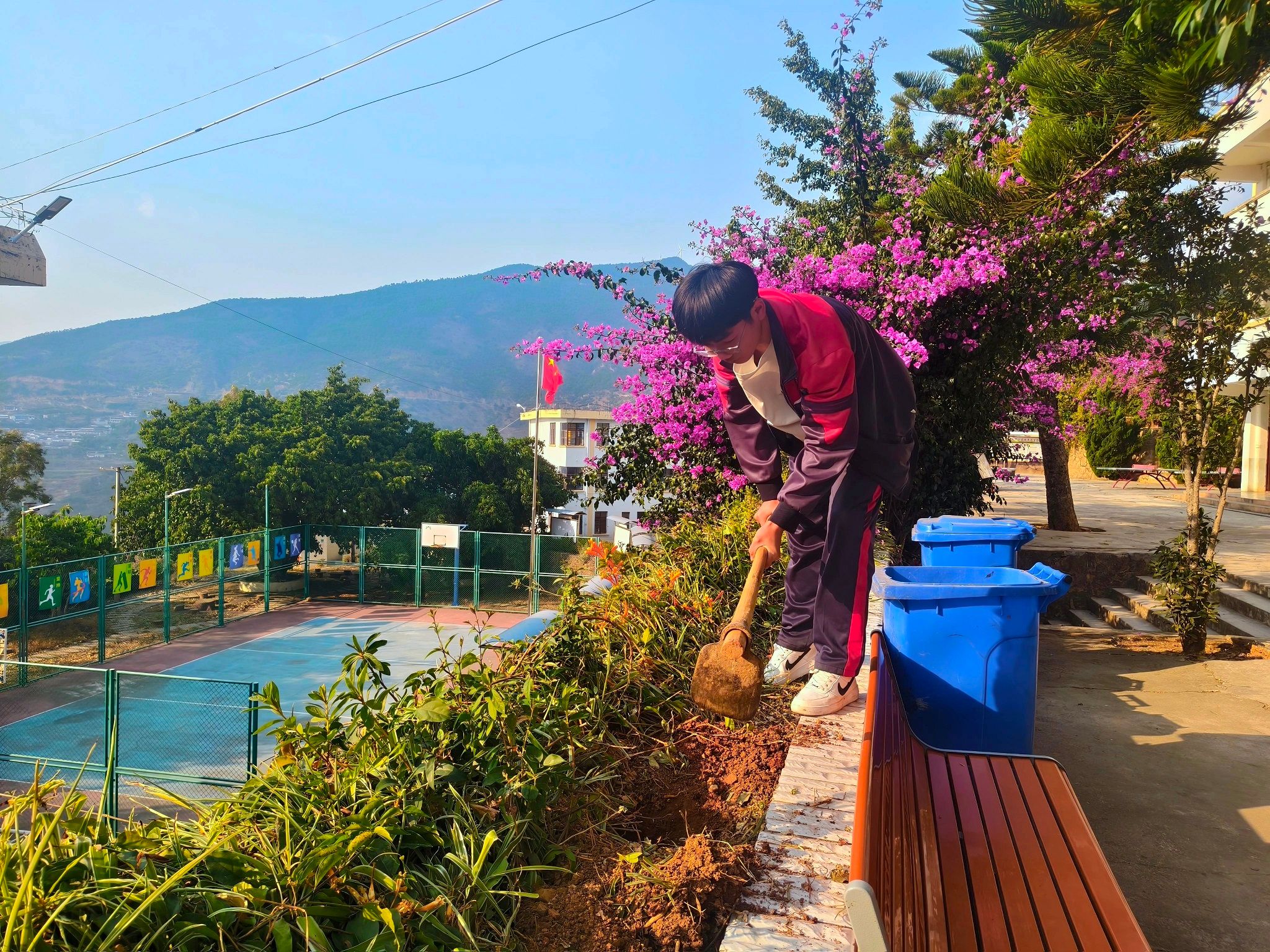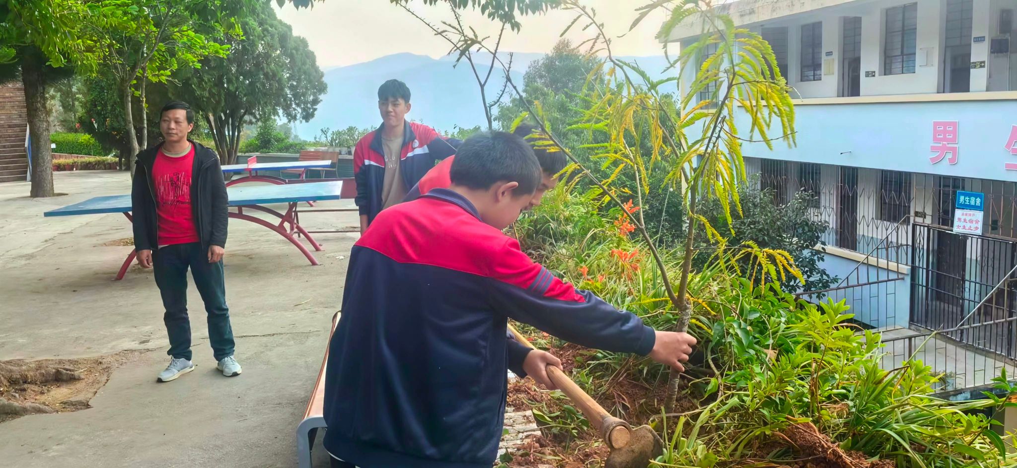 夕阳西下,活动渐入尾声。各班师生在自己打造的劳动成果前合影留念,校园恢复了宁静,但那一株株新栽的橄榄树、一方方平整的菜地、一处处修剪一新的花木,都在无声地诉说着这一天的故事。