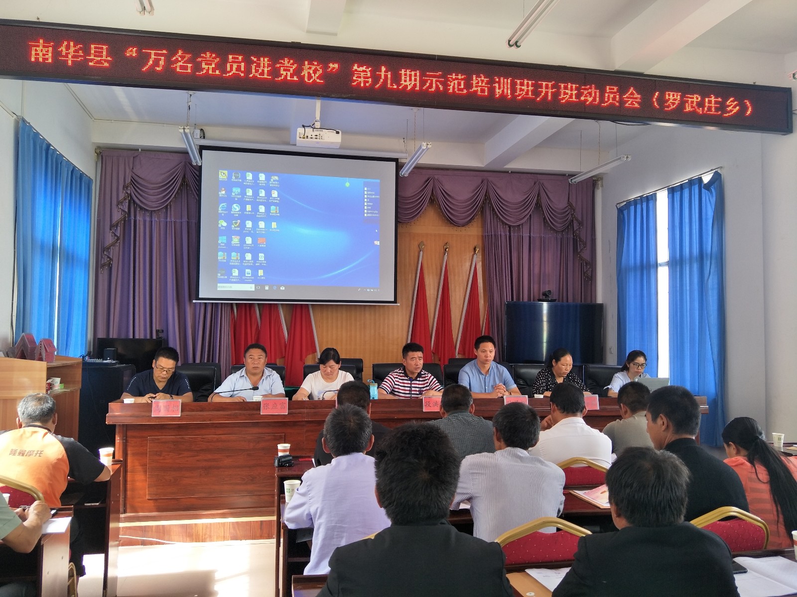 乡党委书记、乡机关站所党支部书记、罗武庄中学、中心校教师党员、7个村委会部分农村党员共计130人参加培训。培训以集中授课、重温入党誓词,奏唱《国歌》、集体过政治生日、观看党性教育专题片、学员心得交流、学习测试等方式进行,并为参训学员颁发结业证书。