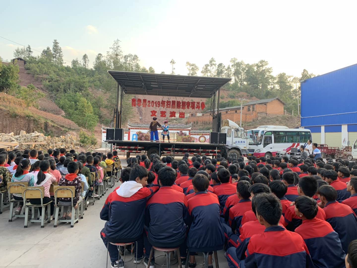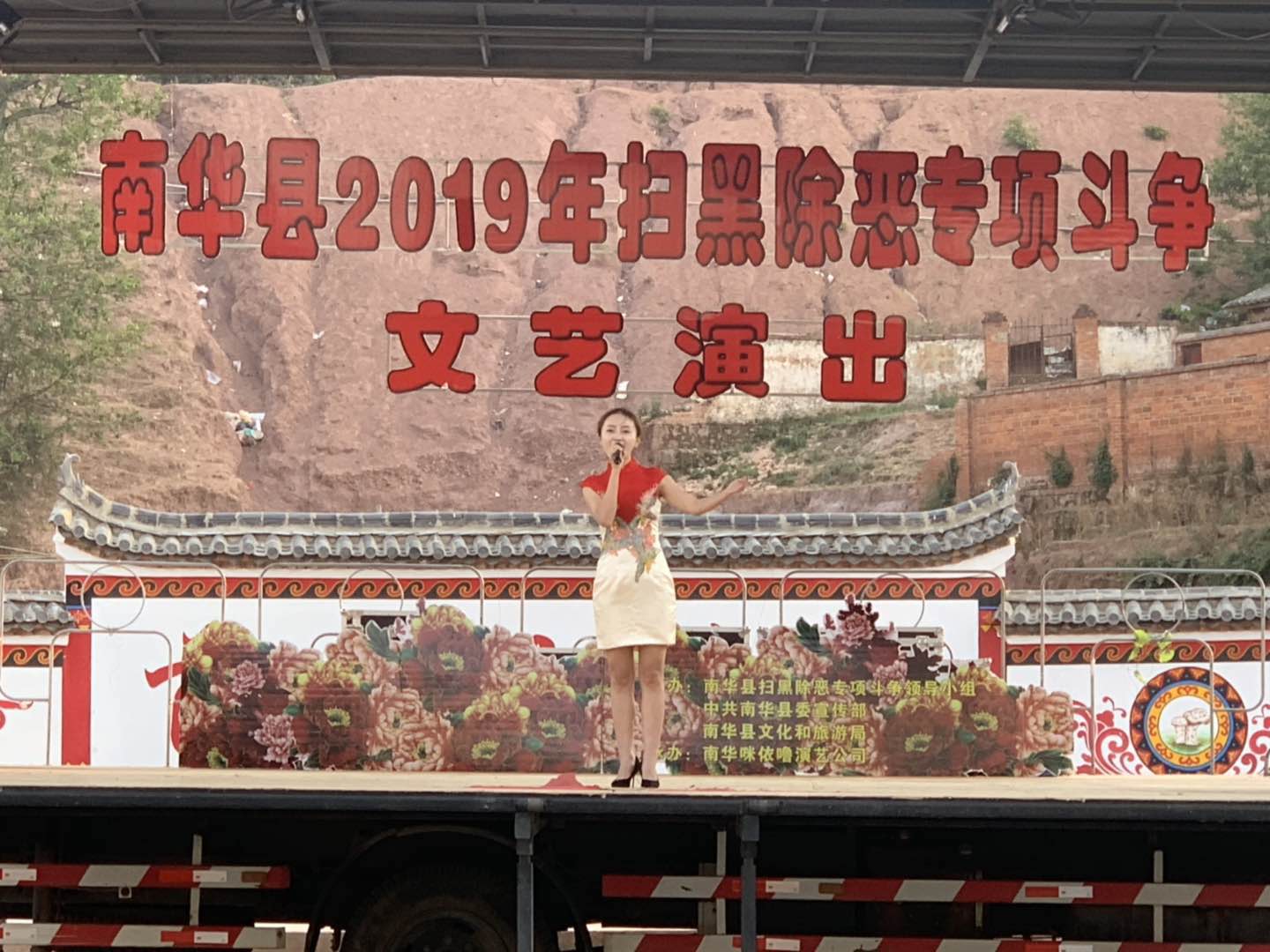 《盛世花开》(舞蹈)、《和谐中国》(独唱)、《夜蒲蟑螂》(小品)、《跃动青春》(舞蹈)、《彝族小调》(独唱)、《扫黑除恶得民心》(快板)、《幸福中国一起来》(独唱)、《羊皮拍出闪闪歌》(舞蹈)、《我和我的祖国》(合唱)等节目轮番上演,一个多小时的激情演出,将扫黑除恶的重大意义与文艺演出完美结合,赢得群众纷纷点赞、叫好。