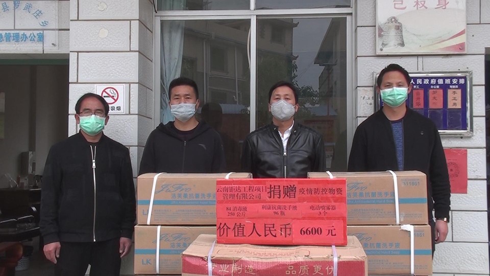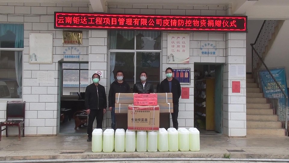 2月24日,云南钜达工程项目管理有限公司负责人吴和龙来到罗武庄,向全乡广大人民群众捐赠了84消毒液250公斤、利康抗菌洗手液96瓶,电动喷雾器3个,价值人民币6600元。“疫情防控一线工作人员非常辛苦,在这个特殊时期,我们只是尽自己的一点绵薄之力,践行社会责任,希望通过我们的捐赠能为罗武庄乡广大一线防控工作出一份力,一起打赢这场人人参与的疫情防控战!”云南钜达工程项目管理有限公司负责人吴和龙说道。