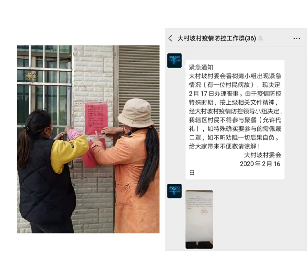 镇人大代表、大村坡村务监督委员会主任鲁存香为了使上级最新疫情防控政策迅速向村民宣传,积极配合镇政府通过广播、张贴标语、发放宣传单等形式宣传防控要求,进行巡逻,对发现有聚餐、聚众打牌等现象及时劝退和制止,同时积极监督劝导群众在疫情期间取消婚宴、乔迁宴等客事,倡导丧事简办。