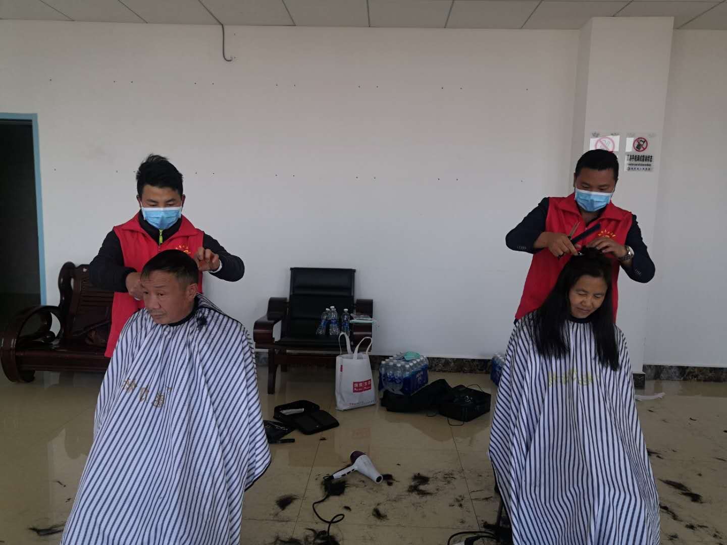 蒋龙是南华县城“金标榜”理发店的老板,是沙桥的女婿,在平日里大家都习惯亲切地叫他阿龙。在新冠肺炎疫情防控期间,为了严格落实疫情防控的相关要求,阿龙关停了在县城经营的三家理发店。看到举国上下都在努力抗疫,阿龙觉得自己也可以做点什么,最后他想到可以为防疫人员提供免费上门理发服务。获得监管部门同意后,阿龙带上4名伙伴,全副武装,深入社区,义务理发。据统计,在疫情防控期间,阿龙团队共服务了300余名干部群众,有警察70余名,医生50余名,贫困户30余名……