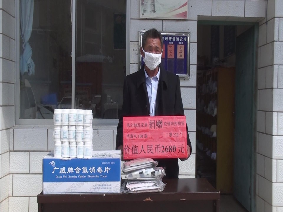 爱心人士陈之敬:在疫情防控工作关键时刻,我作为一名退休职工,受党和人民培养多年,家乡人民群众需要疫情防控物资,我带领我的家人向乡亲们献出微薄之力,这是我的义务和责任。我相信我们一定能克服困难,万众一心,共同努力,打好疫情防控阻击战。