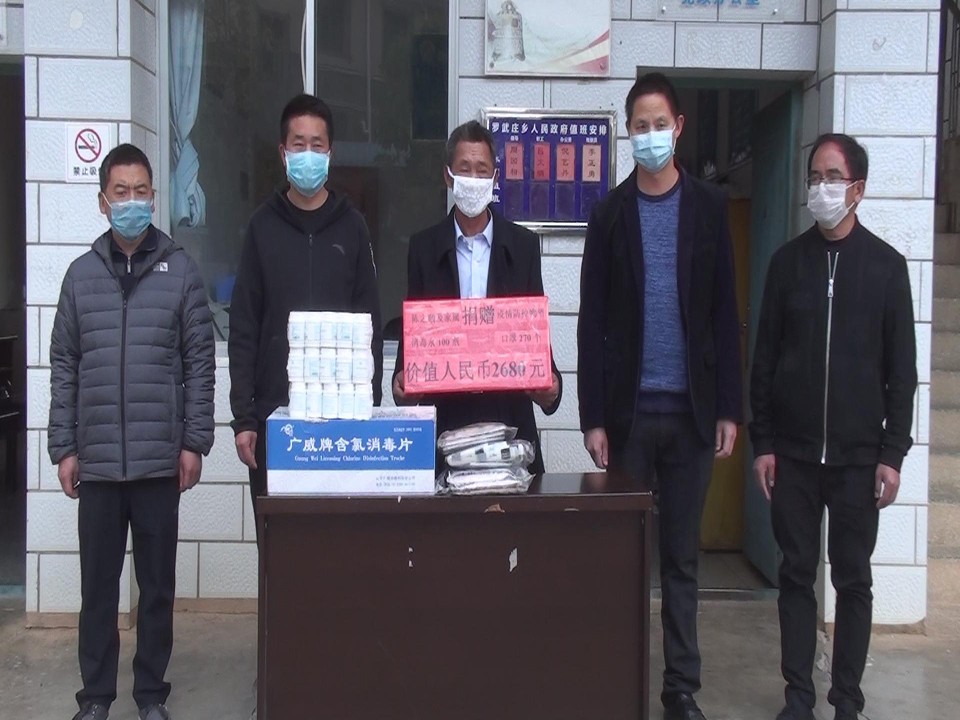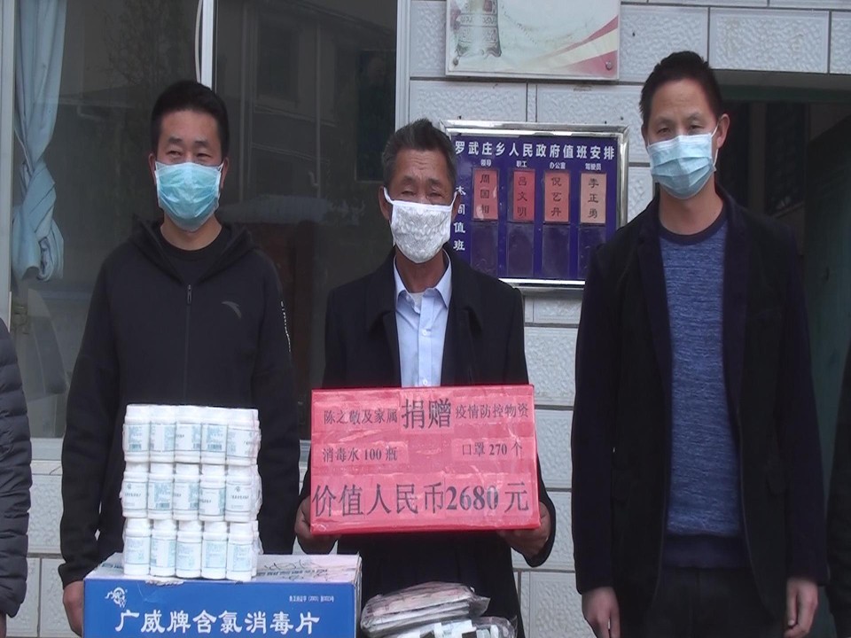 2月5日下午,在罗武庄乡政府院内,一场抗击疫情的爱心捐赠仪式在这里举行,退休职工陈之敬,为家乡人民送来了消毒片100瓶,口罩270只,委托罗武庄乡党委政府统一调配,第一时间支援疫情防控一线人员和公共卫生消毒。