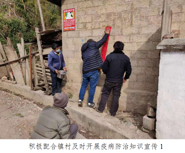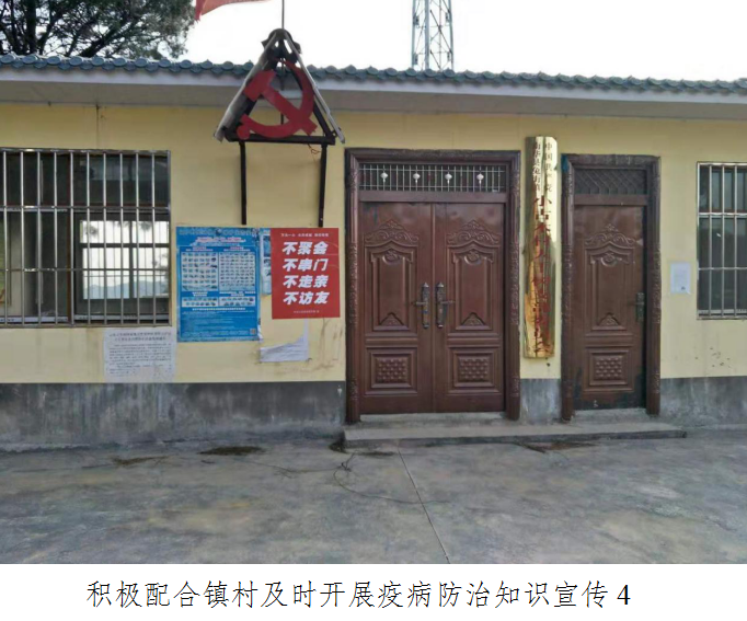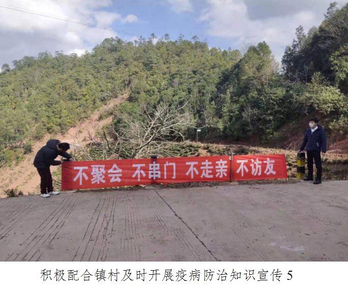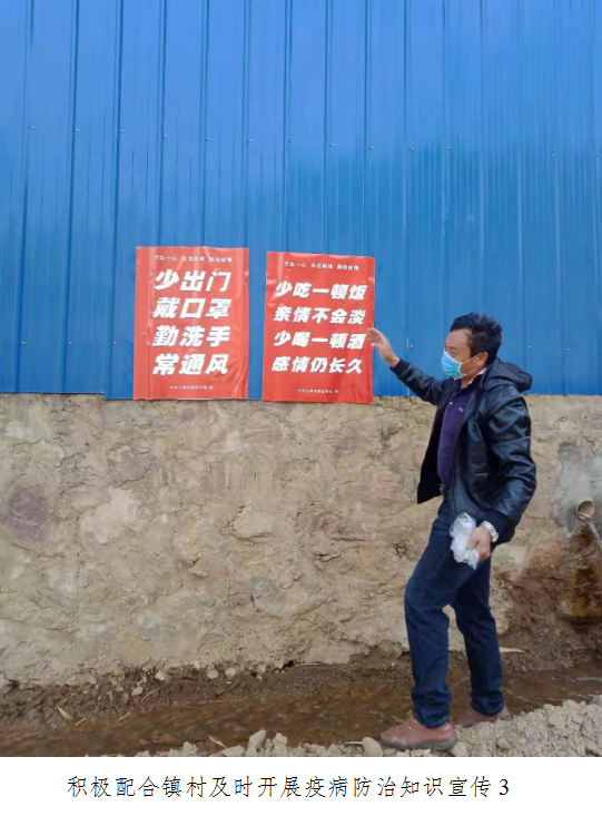 三是积极配合镇村及时开展疫病防治知识宣传。通过微信群、发放倡议书等形式,开展疫病防治知识宣传,做好群众宣传教育工作,动员群众改善生活习惯,引导群众不去人群聚集的地方、不去已经有疫情的城市和地区,尽量减少与疫情城市回来人员的接触,做好个人防护,如果到公共场所务必要戴口罩,不参加各类聚集性的民俗活动,减少探亲访友,不参加聚餐,不搞亲朋好友之间轮流宴请。同时做好对谣言的打击力度,教育群众不信谣不传谣,安抚群众恐慌情绪,维护社会稳定。2月1日,出动车辆10余次,人员200余人次深入各村开展政策和疫情防护知识宣传,督促各村开展疫情防控工作,通过镇村组等微信群发布通知、公告200余条。在公路沿线、村组、集市等悬挂布标15条。自1月22日以来,累计出动车辆50余次,人员2193人投入到疫情防控工作中,累计发布通知、公告600余条,在公路沿线、村组、集市等粘贴通知、公告、悬挂标语200余条。