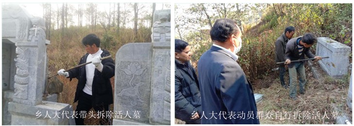 强化示范带动。充分发挥人大代表的模范带头作用,50名县乡两级人大代表带头参与殡葬改革工作,认真做好家人、亲朋好友的思想工作,自觉签订殡葬改革告知书,自行有序拆除“活人墓”,扎实开展大墓豪华墓专项整治工作,目前全乡共拆除活人墓24穴,整治大墓豪华墓392穴。