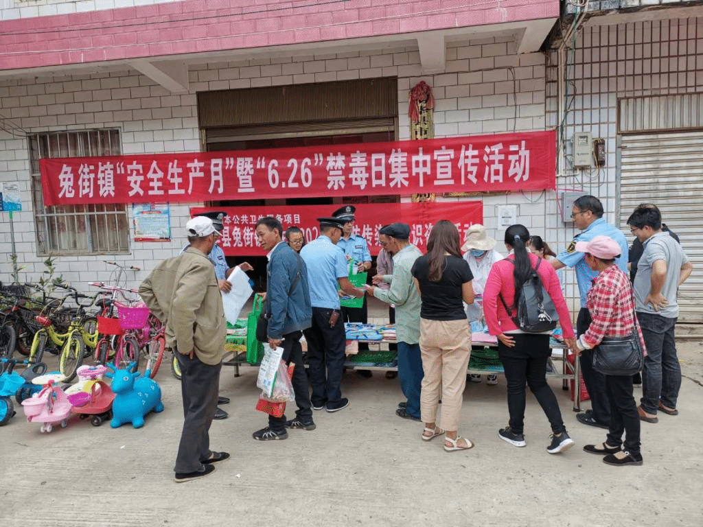 为进一步提高辖区内群众法治意识,安全生产意识,增强法治观念,提升村民科学素质。6月23日,在镇党委政府的统一部署下,镇综治办、兔街派出所、司法所、市场监督管理所、兔街卫生院、农业农村服务中心、安委办等多家部门联合,于“6.26国际禁毒日”前最后一个兔街赶集日,开展安全生产、普法、禁毒、、森林防火、农村实用科技等宣传活动。