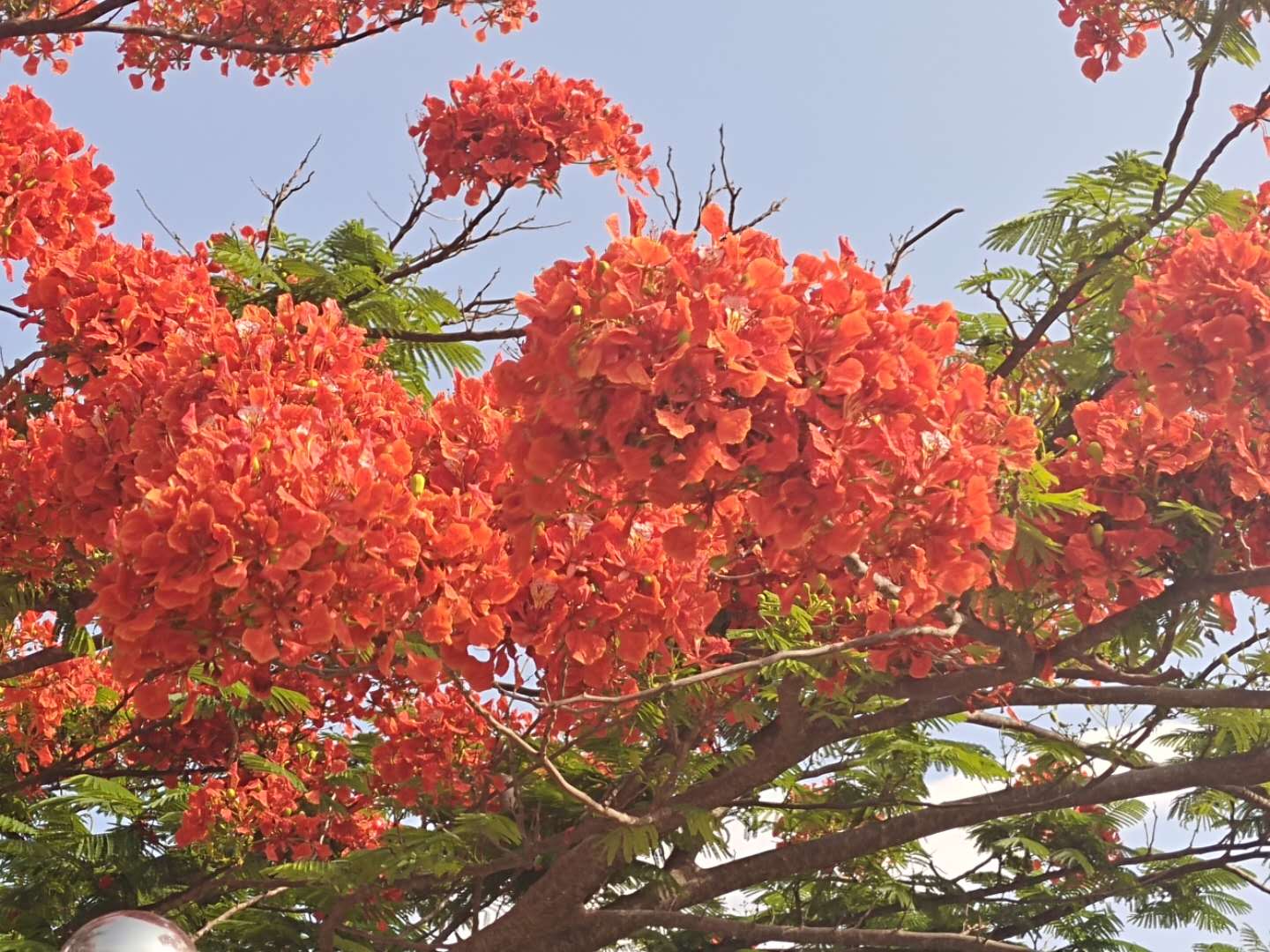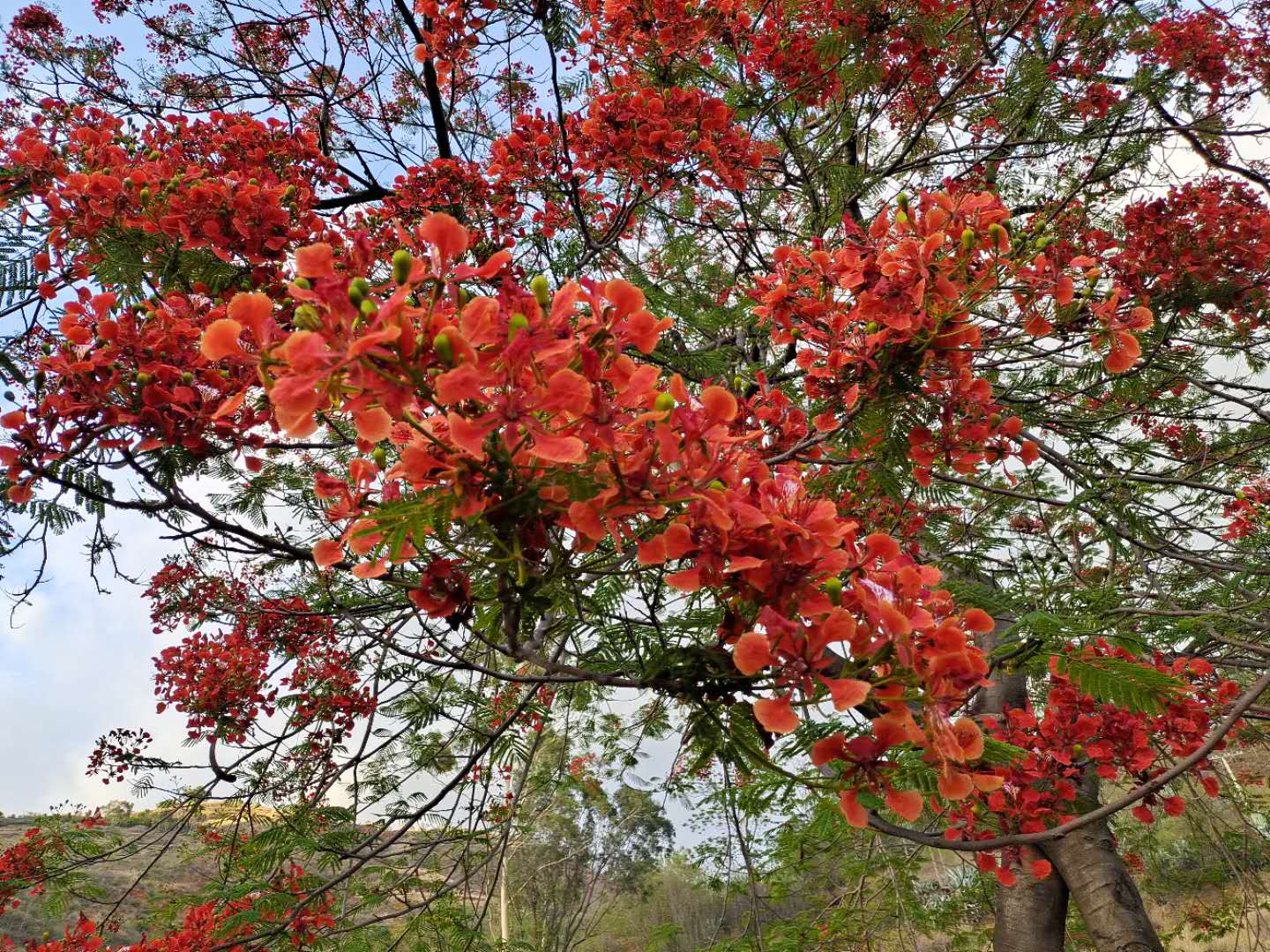 初闻凤凰花,只知其名不知其意。翻阅资料得知“叶如飞凰之羽,花若丹凤之冠”,别名金凤花、红花楹树、火树、洋楹等。夏季开花,花开满树怒放如火,其独特的形状,如同一个巨大宝盖,又如同一把张开的红色大罗伞,下垂的花枝,显得分外妖娆。