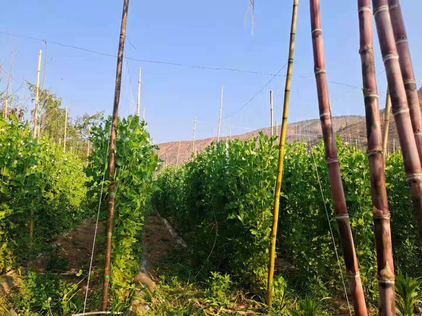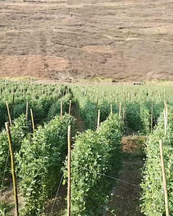 初春的阳光温柔的洒在红土大地上,万物静待复苏,礼舍江畔早已绿意盎然,生机勃勃。一片绿油油的荷兰豆映入眼帘,一颗颗笔直的竹竿上挂满密密麻麻的人工丝线,豌豆苗沿着支架网线向上攀爬生长,成为豆苗的茁壮成长坚实的“依靠”。