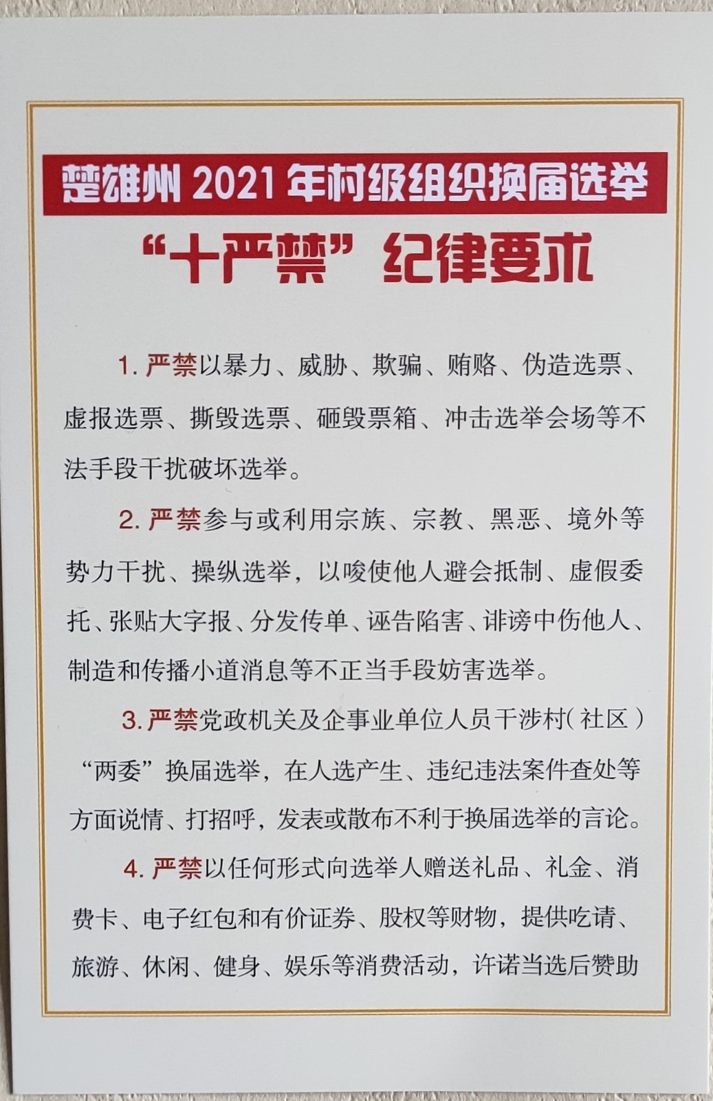 把牢严明纪律关键。广泛宣传换届选举纪律要求,广泛发放《楚雄州2021年村级组织换届选举“十严禁”纪律要求》卡,严肃换届风气;对全体换届工作人员和候选人预备人选逐人签订纪律承诺书,强化法纪意识;畅通来信来访渠道,镇、村两级均及时公布举报电话及邮箱,设置30个举报箱及接待处,引导党员群众依法依规参与、自愿自主行使选举权力;成立镇换届纪律督查组不定期开展督查检查。