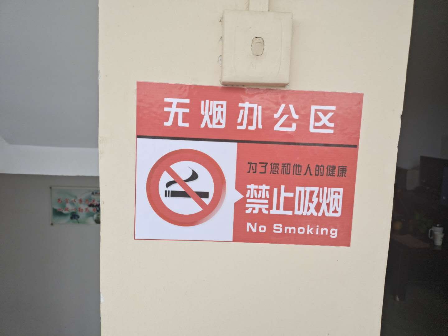 硬件设施配备到位。在办公室、会议室、楼梯等醒目场所设立禁烟标志、禁烟制度,会议室、办公室内严禁出现香烟、烟缸等相关物品。为了避免吸烟人员给他人带来危害,设置室外吸烟区,同时定期开展控烟教育。