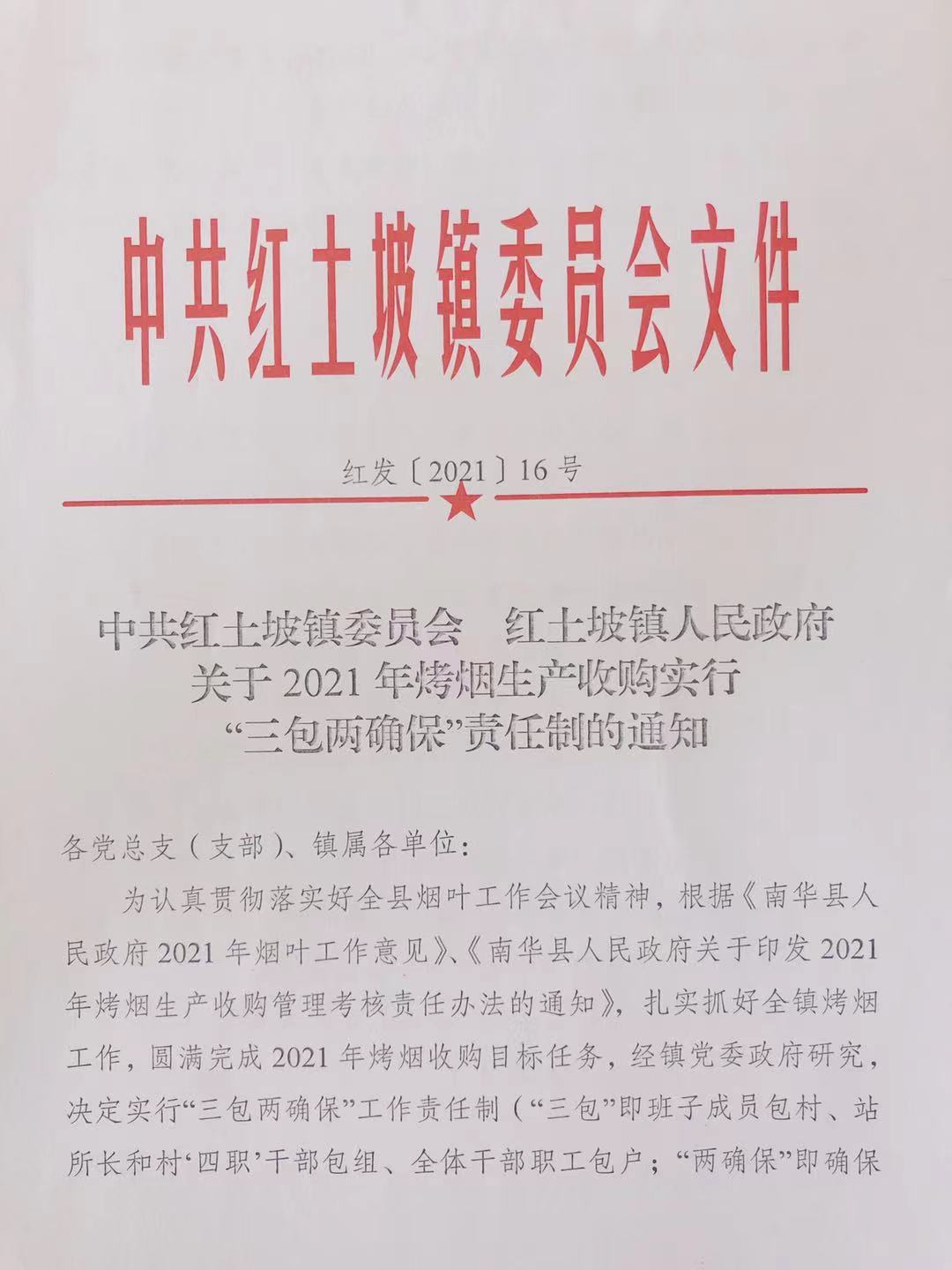 红土坡镇针对今年烤烟生产中群众积极性有所下降、种烟农户减少的实际,实行班子成员包村、站所长及村“四职”包组、全体干部职工包户;确保按时按质移栽、确保按时交质交售的“三包两确保”责任制,为高质量完成烤烟生产任务奠定基础。