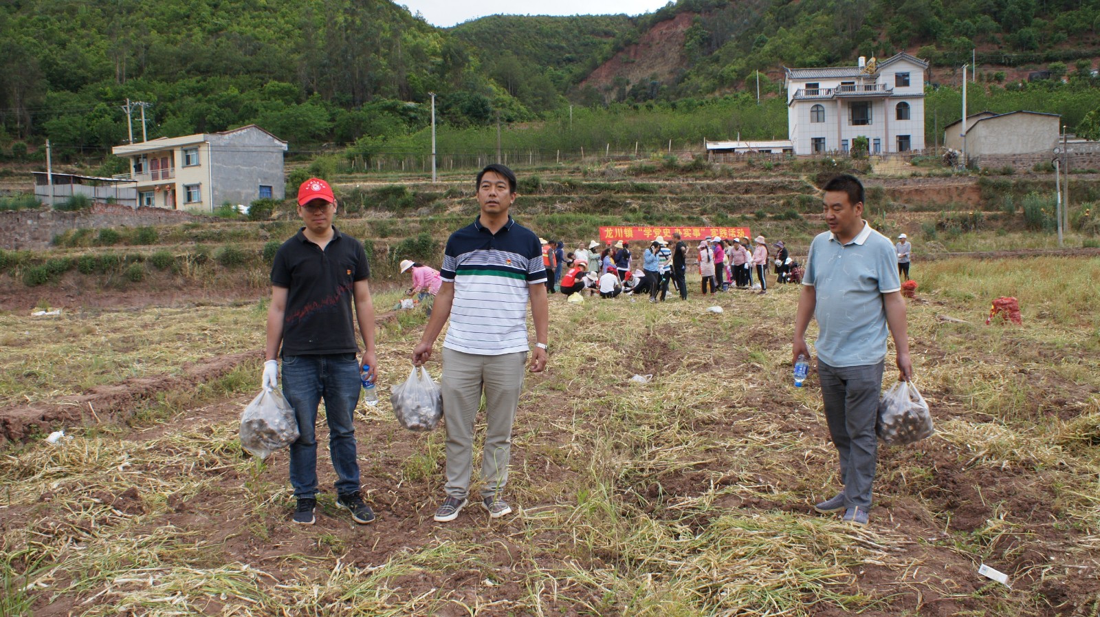 5月7日下午,龙川镇组织镇属4个党支部60余名党员到蟠龙村委会民家村大蒜种植基地开展党史学习教育“我为群众办实事——助农促增收”活动。