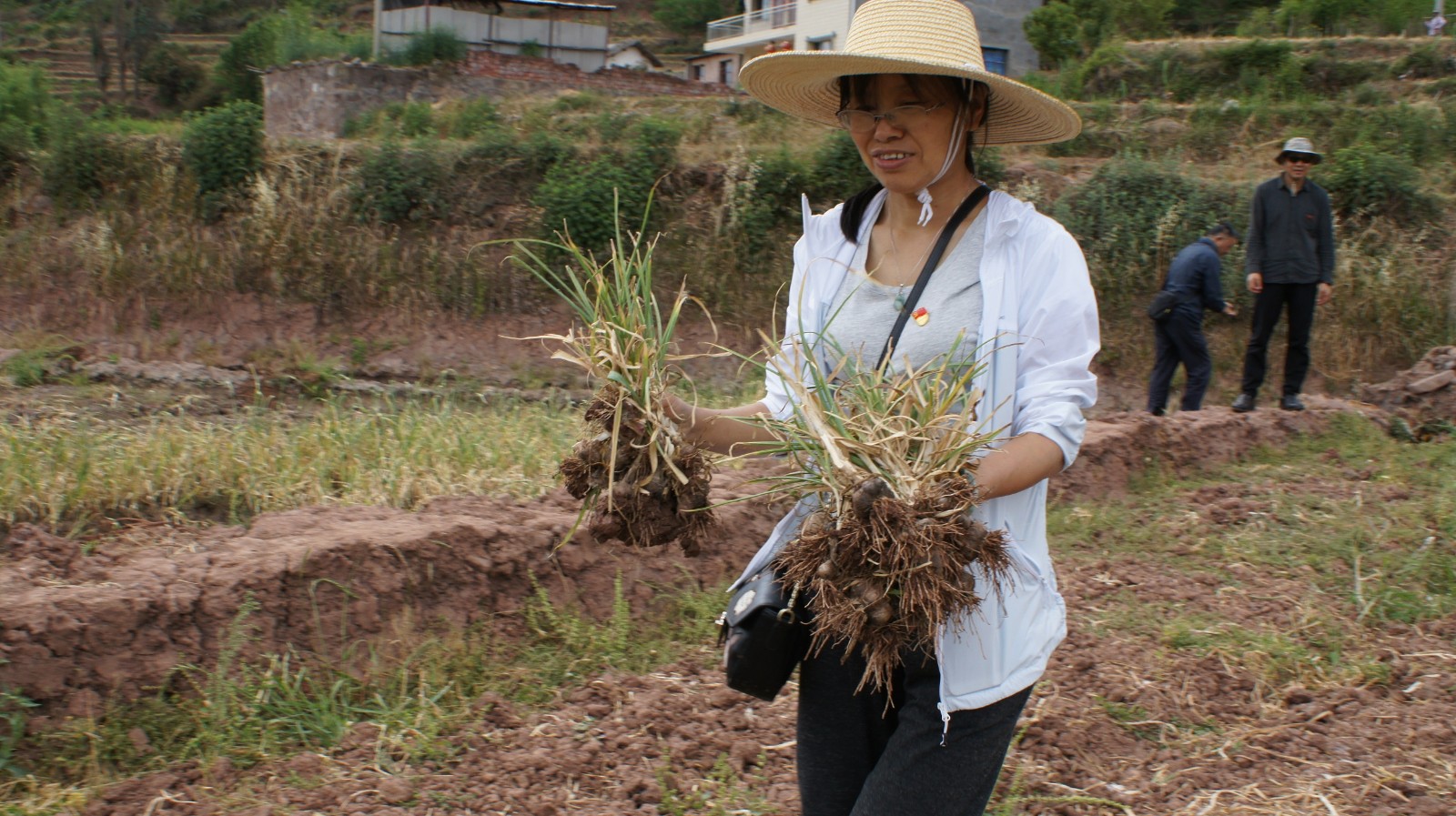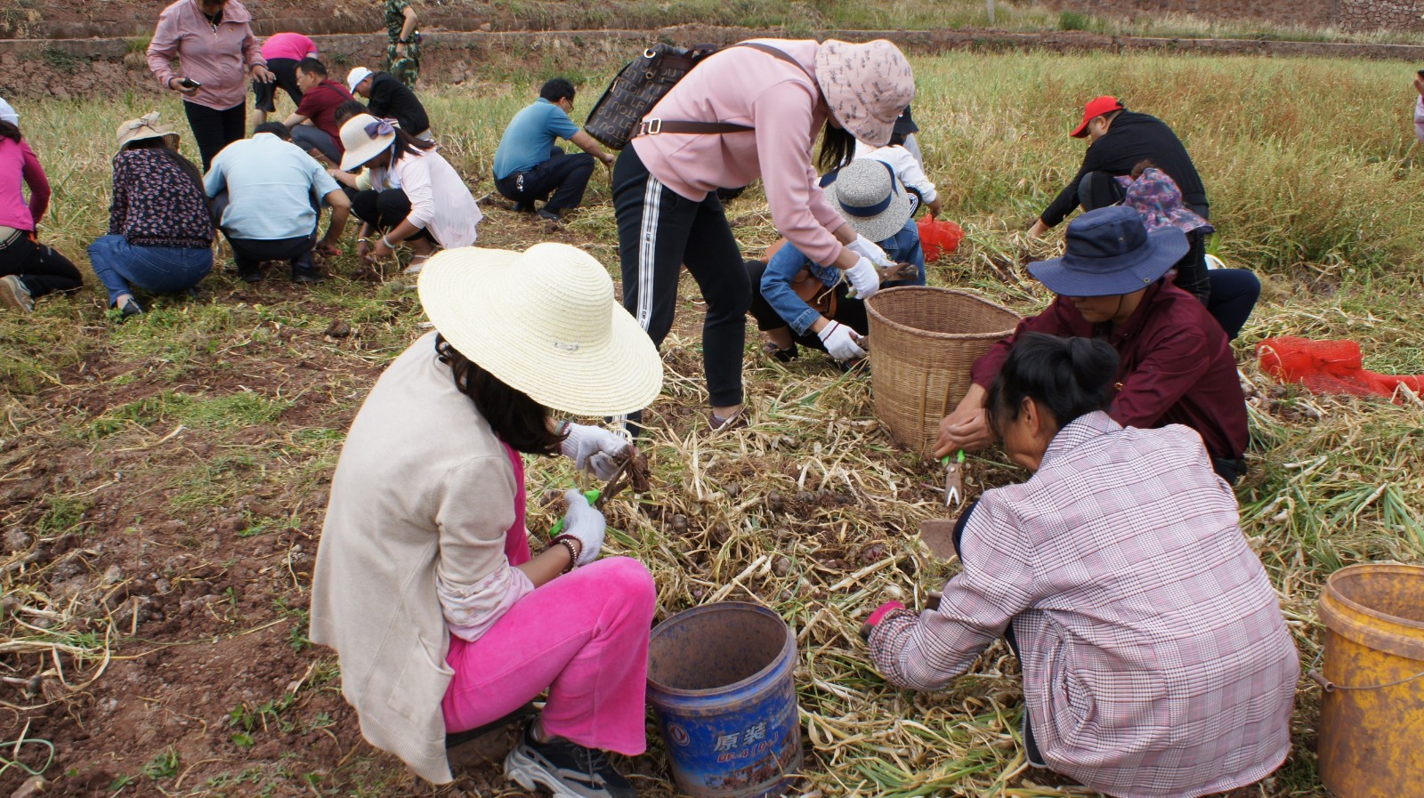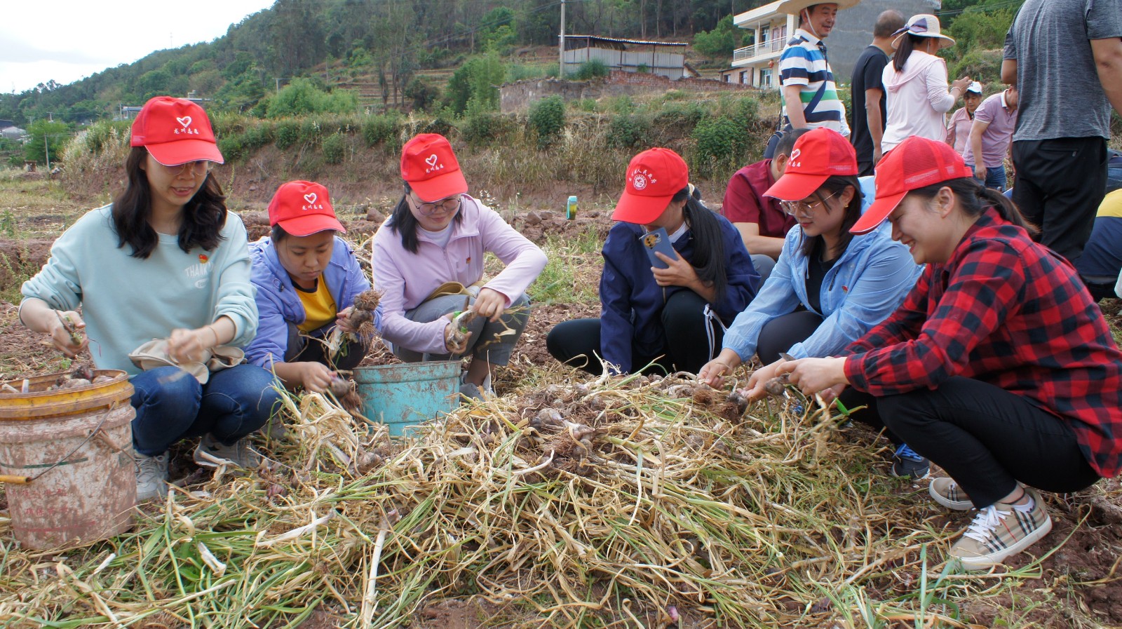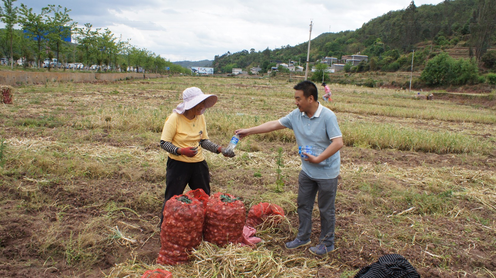 随后,参加活动的部分党员为正在田里采收大蒜的群众送上了“爱心”饮用水,并叮嘱他们在高温天气注意防晒防暑;全体参加活动党员在认真聆听了群众的“技术指导”后积极参与到爱心助农活动中,帮群众拔蒜、断茎、修根、装袋,忙得不亦乐乎;最后,党员们还向群众购买了53公斤大蒜,力所能及助农促增收。