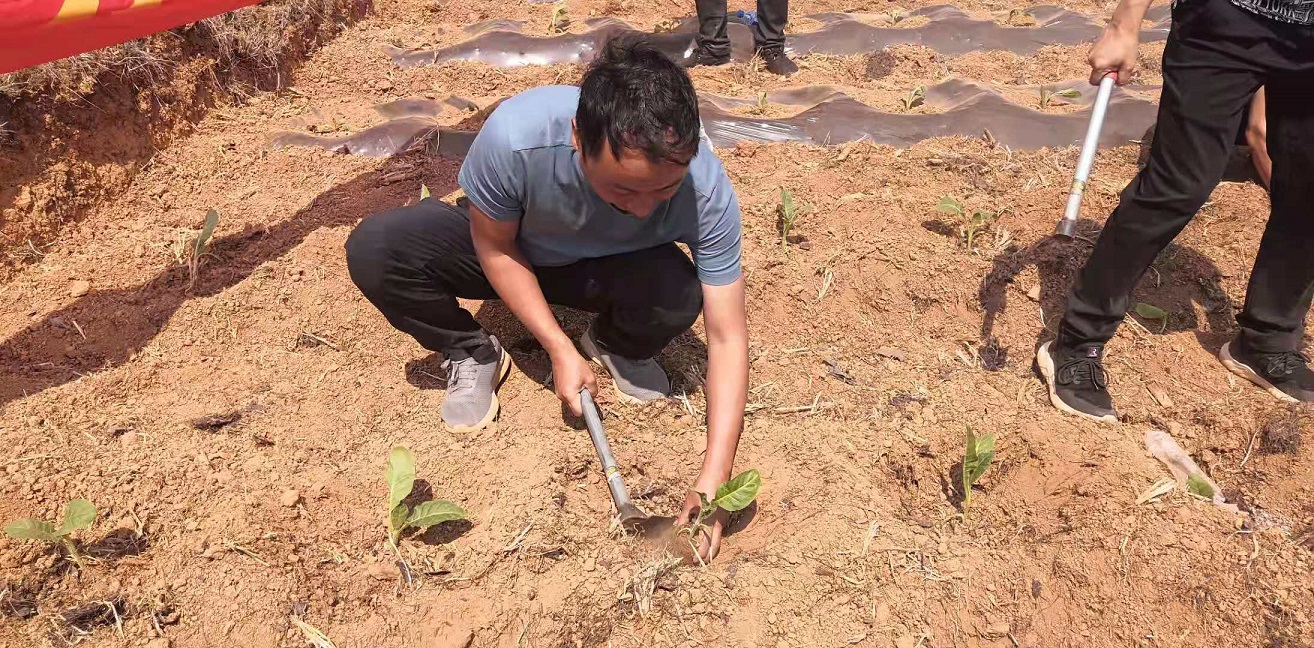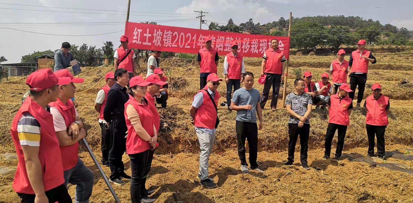 在红土坡镇簪花村委会写字树村民小组200多亩的烤烟样板地里,一支身穿红马甲,头戴小红帽的“志愿服务队”先召开了烤烟移栽现场会议,进行移栽技术培训。随即开展“助农促春耕”活动,大家撸起袖子,弯着腰放苗、培土、浇水、盖膜,不顾炎炎烈日,忙得不亦乐乎。他们齐心协力,不偷懒躲懒,没多大会儿功夫,就把烟农陈宗平家两亩多的烟苗移栽完成了,虽然大家看起来一个个灰头土脸的,脸上却洋溢着灿烂的笑容。