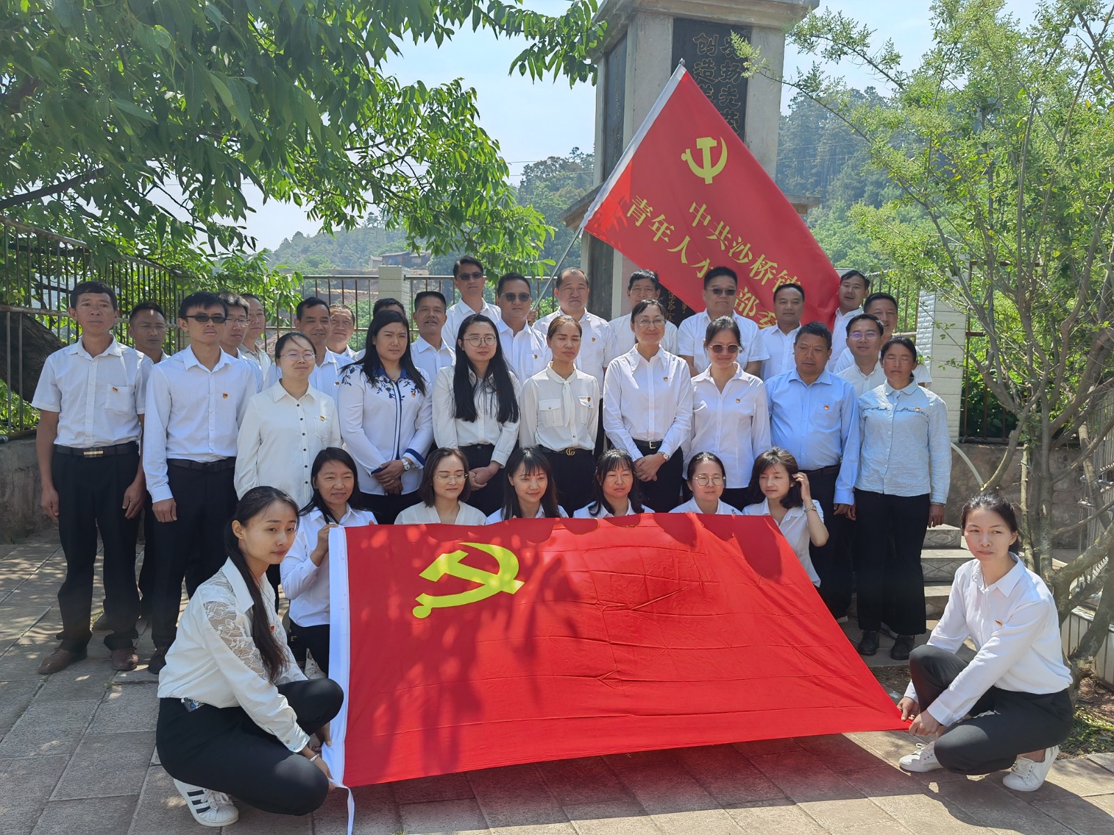在接受党课洗礼之后,两个党支部全体党员共同走进位于沙桥镇瓦黑井村委会大田村的边纵八支队整训改编旧址参观学习,在纪念碑前全体党员奏唱中华人民共和国国歌;重温入党誓词;缅怀革命先烈,向革命烈士默哀并敬献鲜花;还邀请县委党史研究室副主任段兴胜同志详细介绍了大田边纵八支队情况及相关党史。