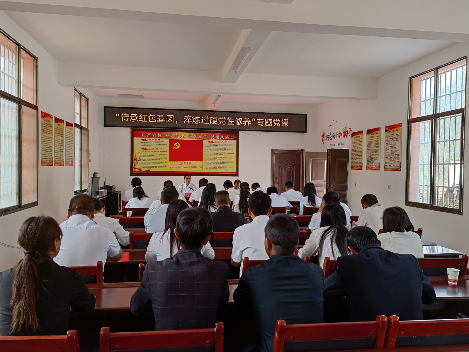 在小古山村委会,魏部长从“铭记党的历史,不忘初心使命;传承红色经典,追忆峥嵘岁月;擦亮党员名片,弘扬革命传统”三个方面讲授了题为“铭记党史 擦亮名片 砥砺奋进”的专题党课,由县委组织部常务副部长张正臣同志主持。