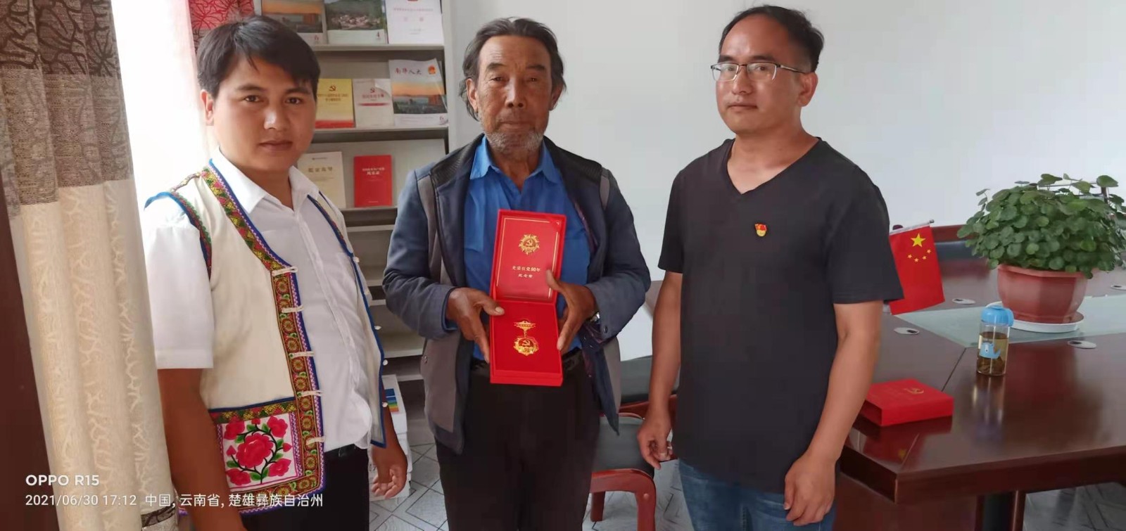 颁授纪念章,薪火永相传。一朝入党、一生为党。乡党委副书记李建荣和羊成庄村党总支书记罗海兴分别为2名老党员代表颁发了“光荣在党50年”纪念章。这纪念章,既是礼赞章,也是奋进章,是对老党员的最好褒奖,他们的优良作风和革命精神,我们将永远传承。