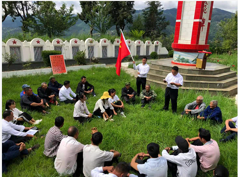 活动中,全体党员重温了入党誓词,组织瞻仰了革命烈士纪念碑和十二位革命烈士墓后,党员同志们围坐在百姓宣讲员的周围,集中学习井冈山精神、长征精神、延安精神;同时认真聆听烈士陵园里先烈革命斗争故事:1950年4月5日夜,暴乱土匪分两路包围马街区政府,向解放军发起进攻,一路从楚雄毕达出发过礼社江经法空包围魁阁领岗,另一路从锈水塘出发经白龙村从蚂蚁堆向区政府进攻。由于敌众我寡,这场保卫战异常激烈。经一夜激战,顽强抵抗的解放军将土匪打退。在这次战斗中,解放军战士黄亚贵、王春保、周有庆、姚常林、张正海、张全平等同志为保卫马街区人民政府和人民群众的生命而光荣牺牲,献出了他们年轻而宝贵的生命......英烈故事把全体党员拉回到了那个战火纷飞的年代,重新回顾了为争取民族解放和人民幸福而献身的革命烈士,再次感受红色教育洗礼。