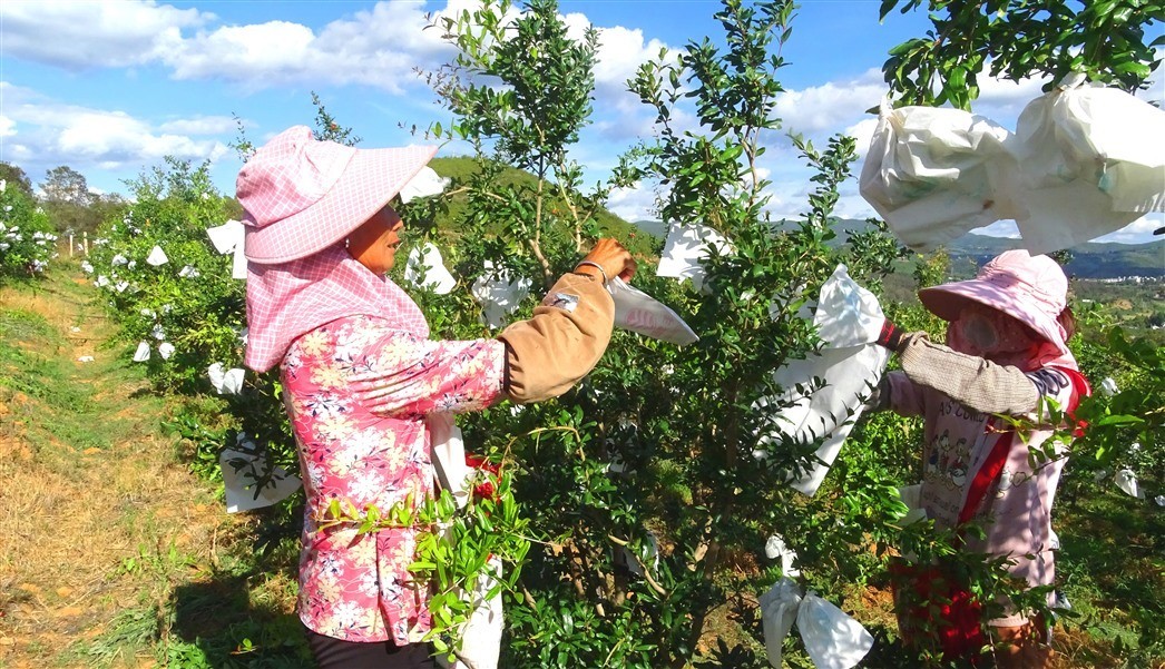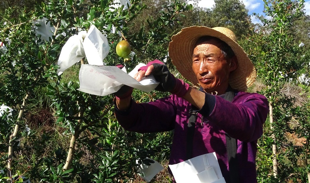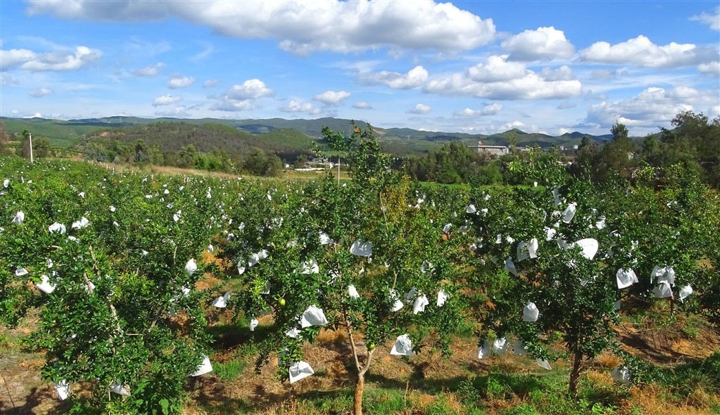 据王正林介绍, 2017年以来,合作社在后甸村委会流转荒山、土地200多亩种植优质软籽石榴,雇请当地40多户农户管理,经过科学栽培和精心管护,目前,大多数软籽石榴己进入丰产期,今年预计总产量达200余吨。石榴果通过套袋后,可以起到防虫、防病害,确保石榴果面光滑、色泽均匀,提高果品质量、提升价值,增加收入。