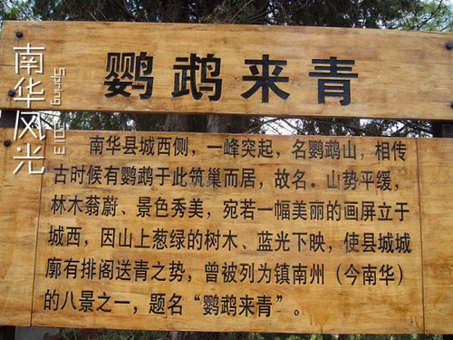 南华县城西侧,一峰突起,名鹦鹉山,相传古时候有鹦鹉于此筑巢而居,故名。山势平缓,林木蓊蔚、景色秀美,宛若一幅美丽的画屏立于城西,因山上葱绿的树木、蓝光下映,使县城城廓有排阁送青之势,曾被列为镇南州(今南华)的八景之一,题名“鹦鹉来青”。