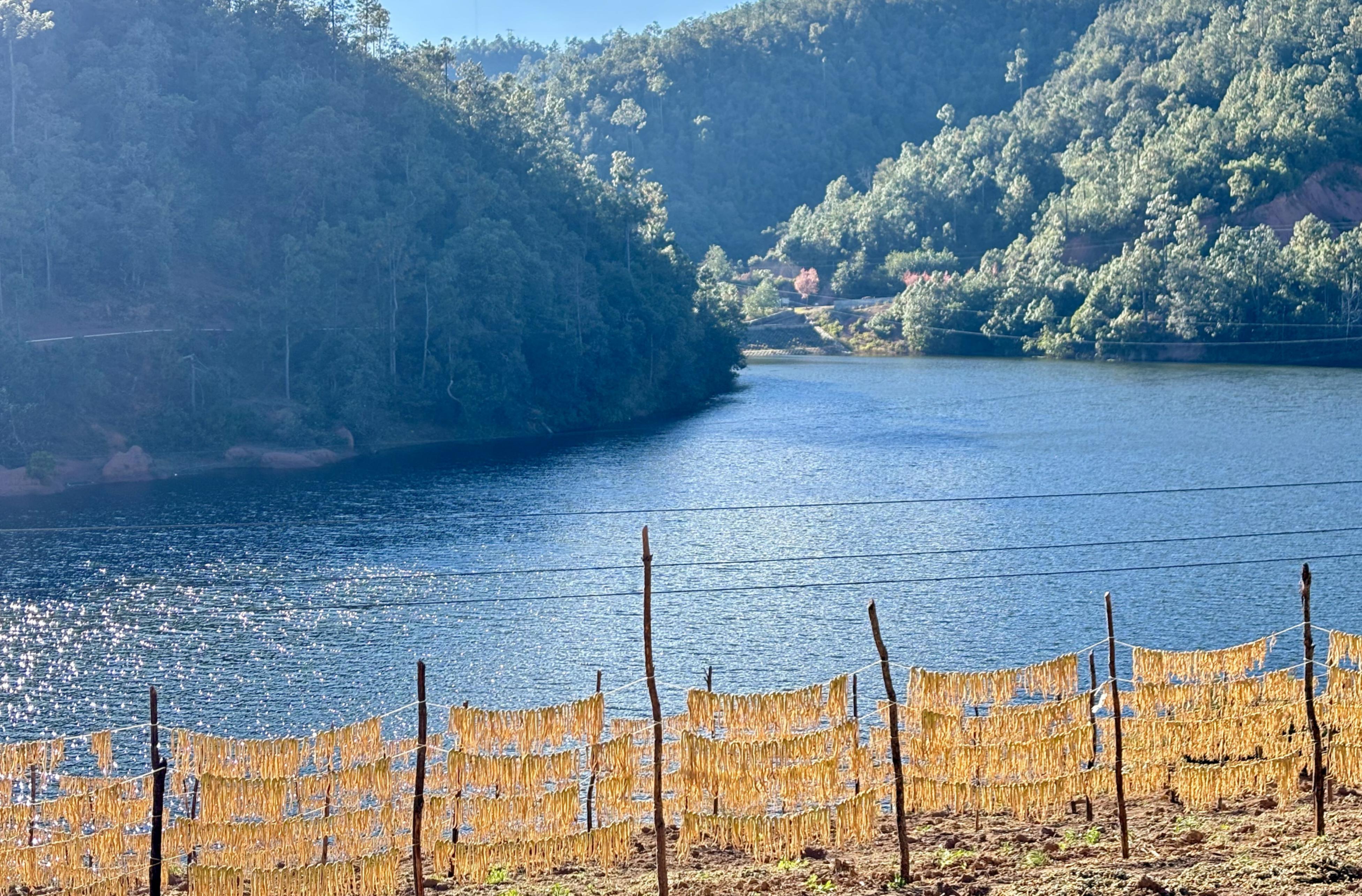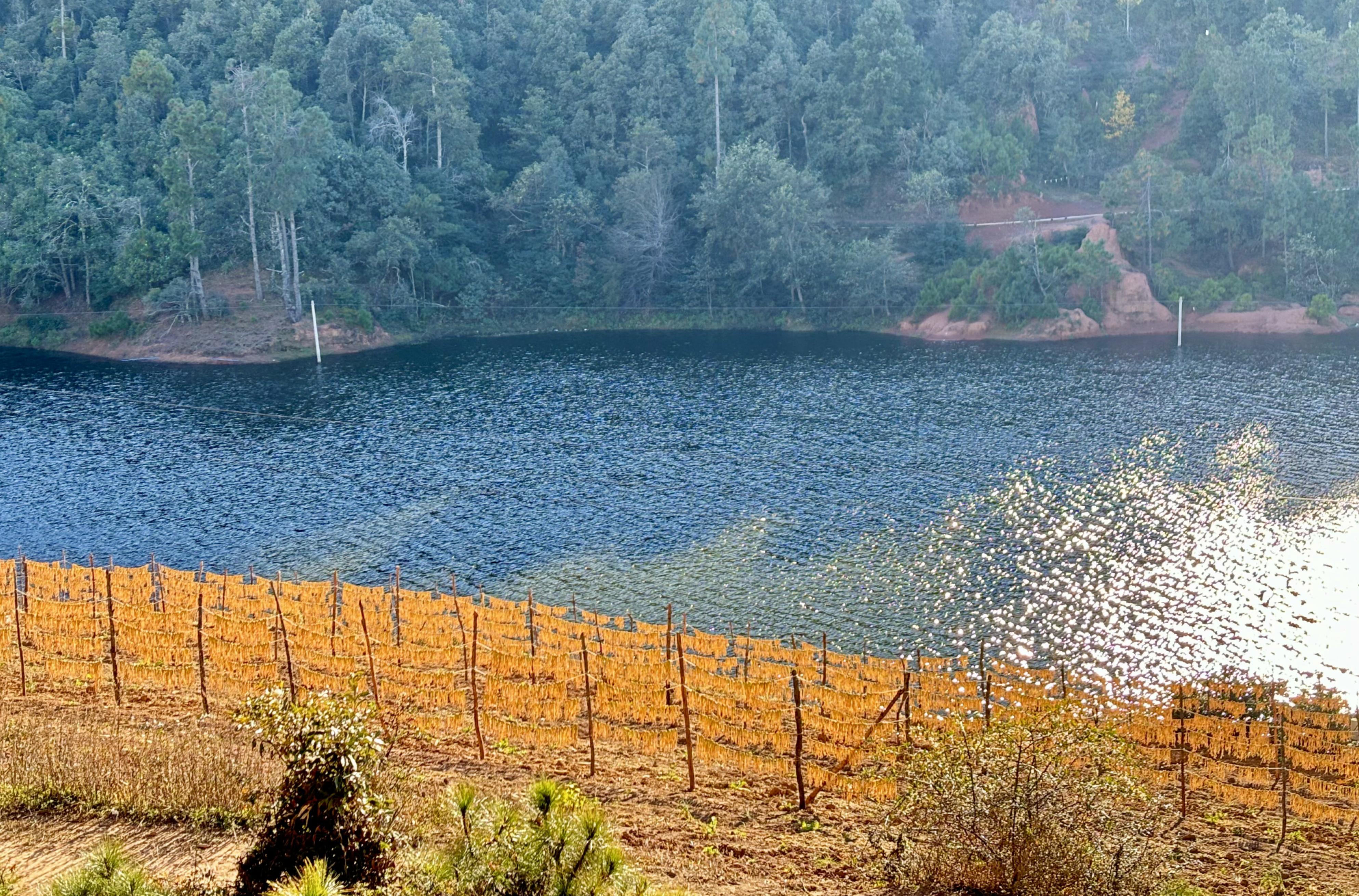 湖边的农房错落有致,与湖水、田野构成了一幅和谐的画面。田野里,萝卜条晾晒在架子上,一排排、一列列,宛如金色的琴弦,在冬日的阳光下弹奏着丰收的乐章。