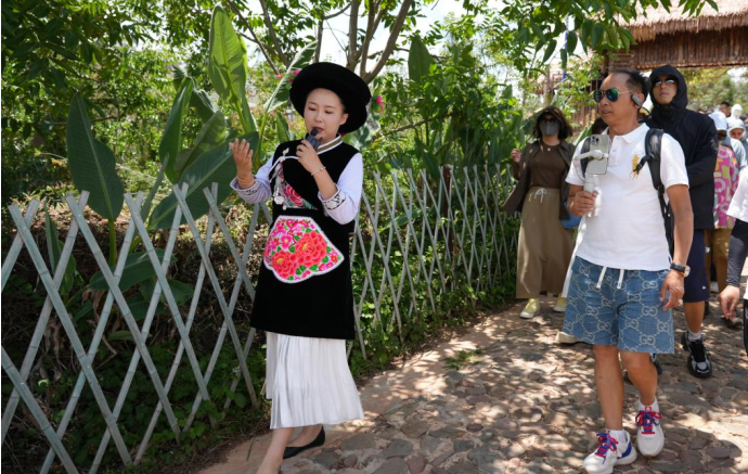 在阿呀噜田园农庄,各位媒体记者和网红达人在工作人员的讲解下,观看白族大刀舞和打跳表演,体验白族非遗扎染,品茗雨露白族三道茶,从热情奔放的民族歌舞到庄重有礼的敬茶仪式,调研团一行在舌尖的苦、甜、酸中感悟田园生活。