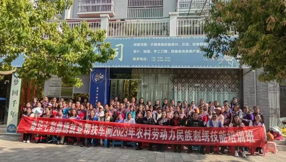 加强技能培训。加强对自由职业绣娘人才的培养,在乡镇建立10个彝绣生产车间,带动60余个村2万余人以及残疾人197人从事彝绣加工,通过以训代赈、以赛代训、远程教学等方式开展刺绣、缝纫、产品设计等技能培训,累计开展民族刺绣技能培训241期13644人次,参与开展民族刺绣的民族7个,人均收入达每月2800元以上,铸牢中华民族共同体意识的根基更加稳固。开展等级认定。建立自由职业民族刺绣人员“数据库”,将重点人物、彝绣传承人纳入基地网格,培养民族刺绣能手2161人,45名绣工列入非遗传承人名录,18名绣娘评定为手绣制作工高级教师,4名专业教师取得国家“手绣制作工”考评员证。袖珍绣女张华芝评为“第六届云南单项工艺大师、小种类工艺大师”。培树领军人才。以南华七彩彝绣文化传播有限公司为重点,强化信用体系评价,统战、民宗部门先后举办统战及民族团结理论培训4期,出台非物质文化遗产传承人管理考核办法和资金补助办法,推进民族刺绣技术提升和技艺创新,彝族服饰省级代表性传承人丁兰英被评选为2022“中国非遗年度人物”,并入选2023年“全国青年非遗传承人扶持计划”,丁兰英、陈海燕、张华芝等47名绣娘成为民族刺绣领军人才。南华七彩彝绣文化传播有限公司被党中央、国务院表彰为全国民族团结进步模范集体。