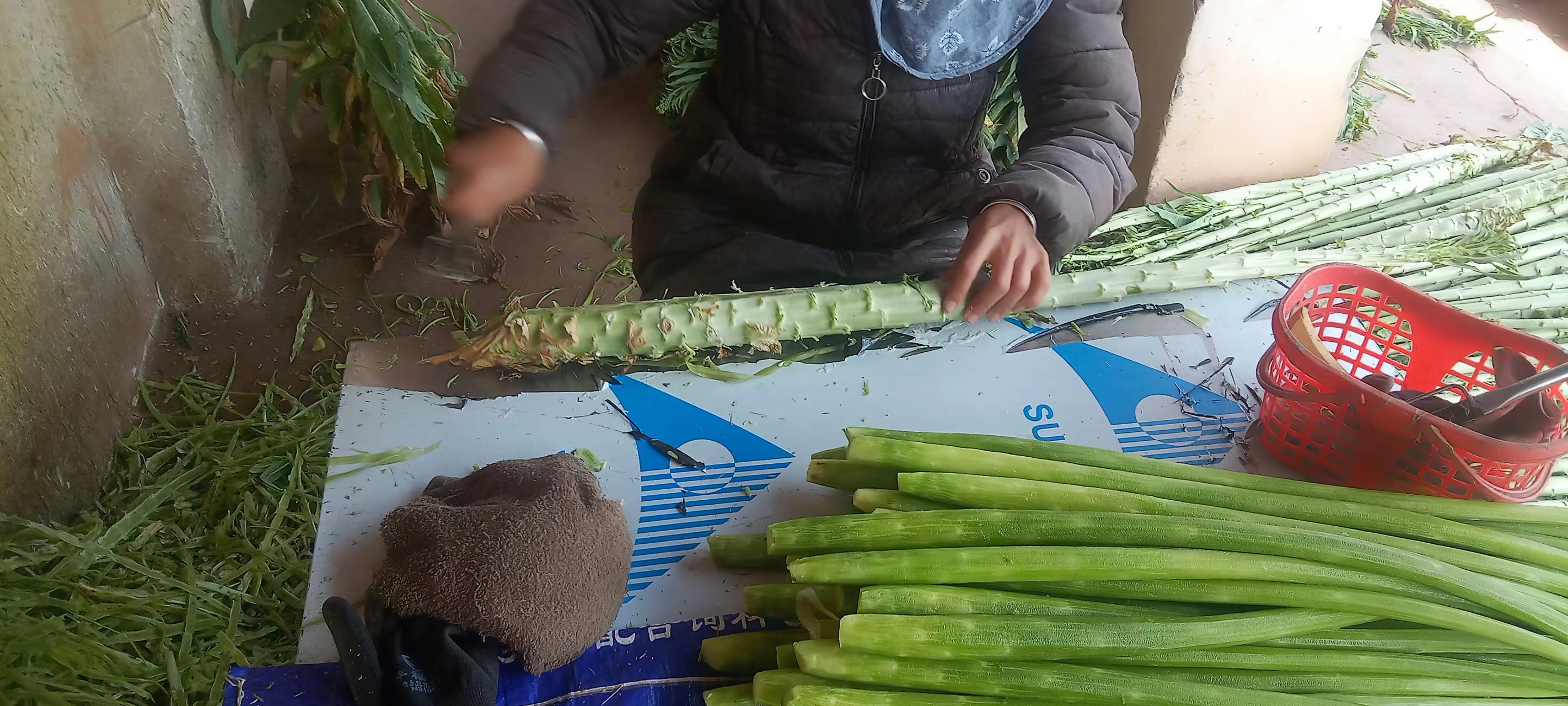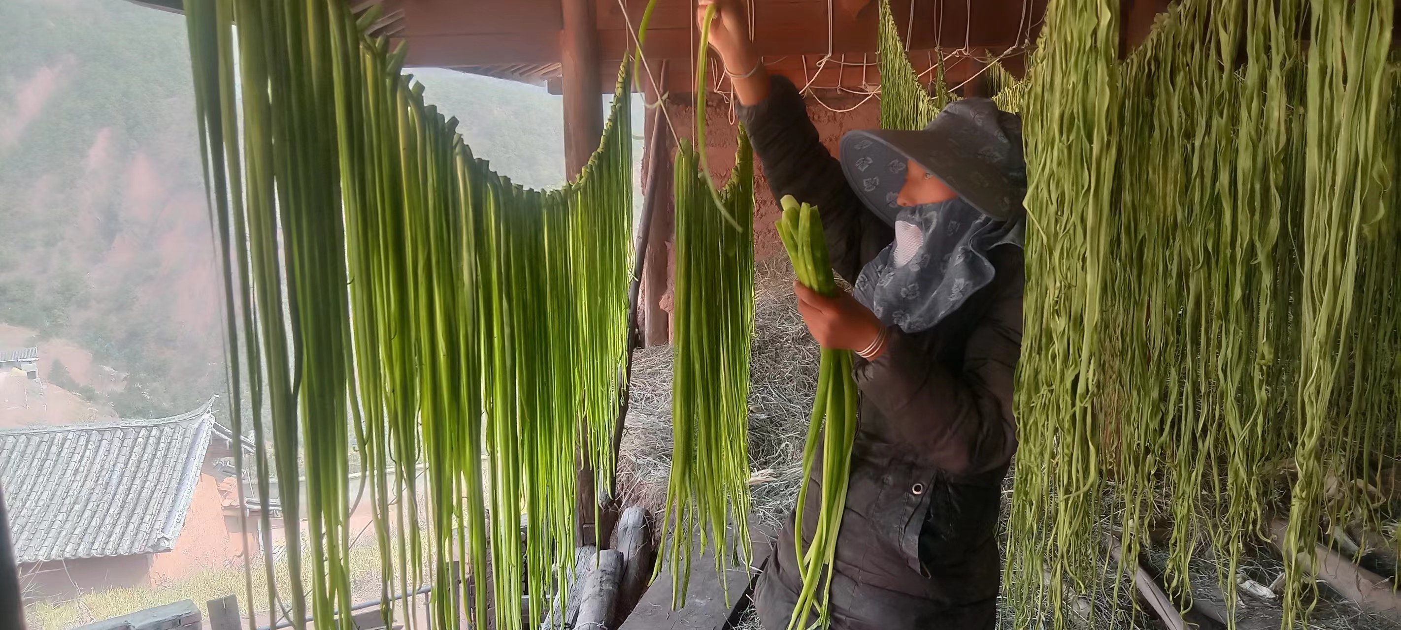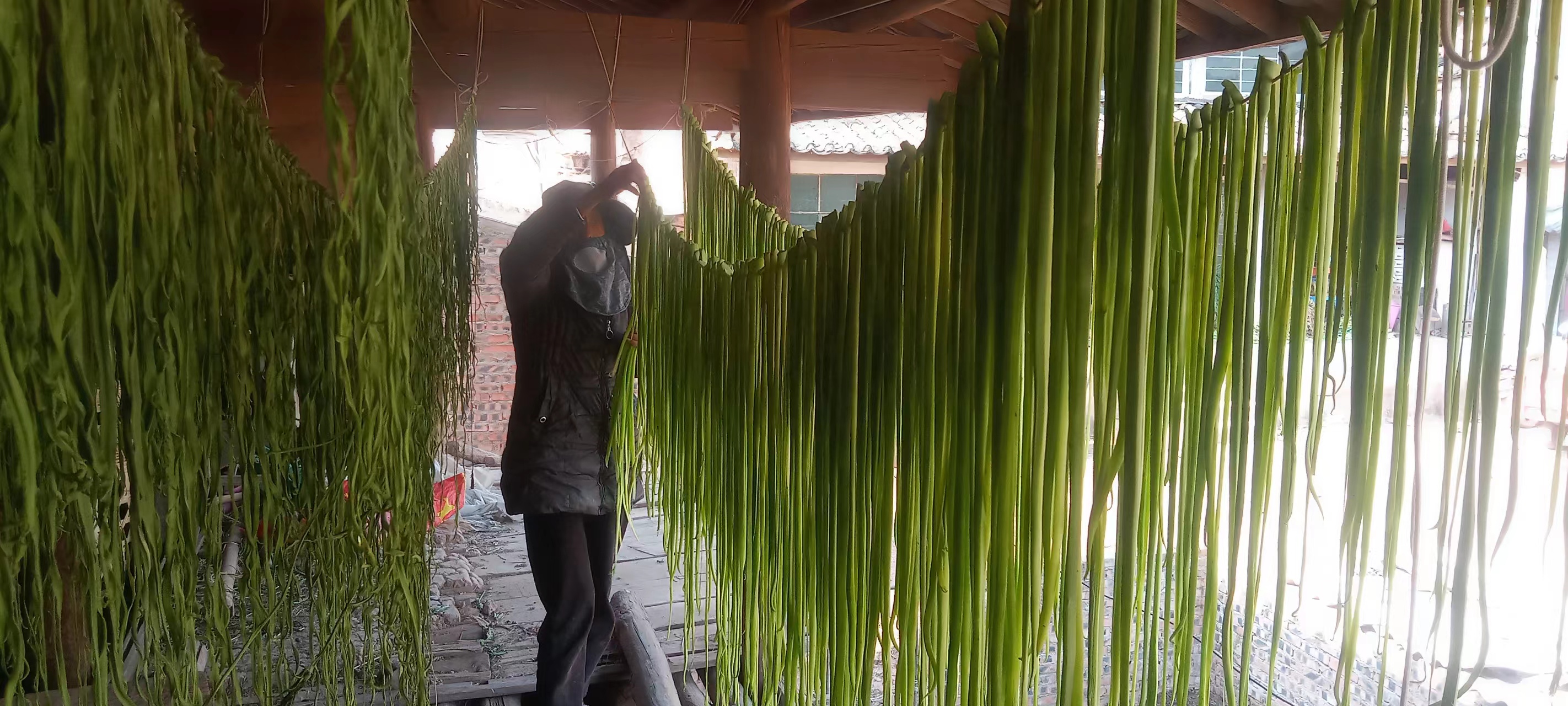 院子里,一杆杆贡菜随风招展,翠绿肥嫩的贡菜经过加工晾晒后宛如一条条碧绿的“翡翠条”,晶莹剔透的挂在晾晒杆上。