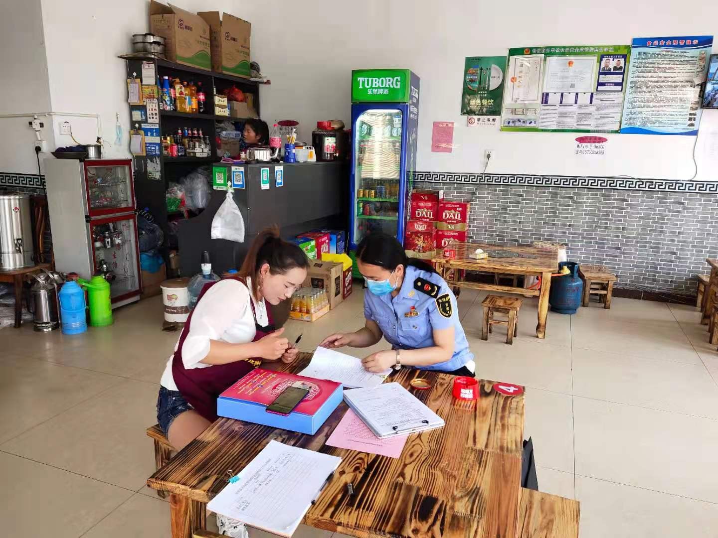 检查中,执法人员实地查看餐饮服务经营者是否具有有效的《食品经营许可证》以及从业人员健康证,是否超范围经营;环境卫生及防蝇、防尘、防虫、防鼠“四防”设施等病媒生物防治措施及公勺公筷使用等疫情防控措施是否落实,要求餐饮单位切实抓好“人员管理、设备管理、原料管理、环境卫生、制度落实”五个维度,严格落实食品安全主体责任,切实降低食品安全风险。