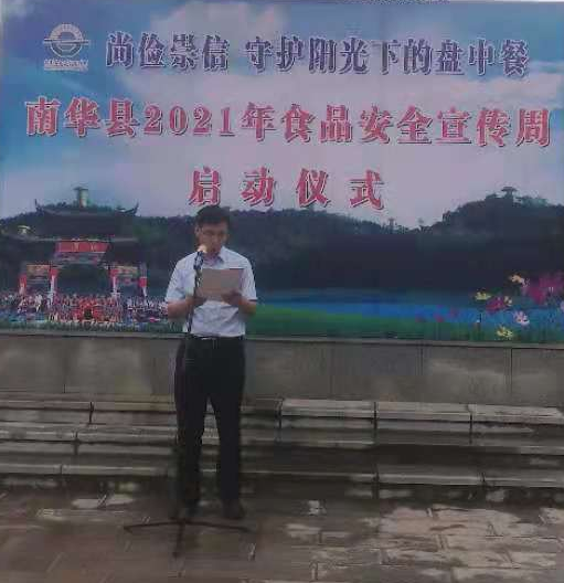 6月8日,南华县2021年食品安全宣传周活动启动仪式在市民广场隆重举行。县食品安全办、市场监管、公安、卫生健康、农业农村、教育体育、发改等24家县食安委成员单位,家世界、万家隆、享满家购物超市等50家食品生产、流通、餐饮企业代表参加了活动。县政府办公室李乾琼副主任主持启动仪式。启动仪式上,县人民政府副县长朱义清出席并致辞。对下步工作作了要求:一是提高政治站位,强化食品安全责任感,营造人人关心食品安全、人人参与食品安全的社会氛围。二是确保食品安全宣传周活动取得实效,为推进食品安全治理体系和治理能力现代化营造积极氛围。三是宣传与整治工作同步并进,抓实食品安全暨食用野生菌中毒防控工作。