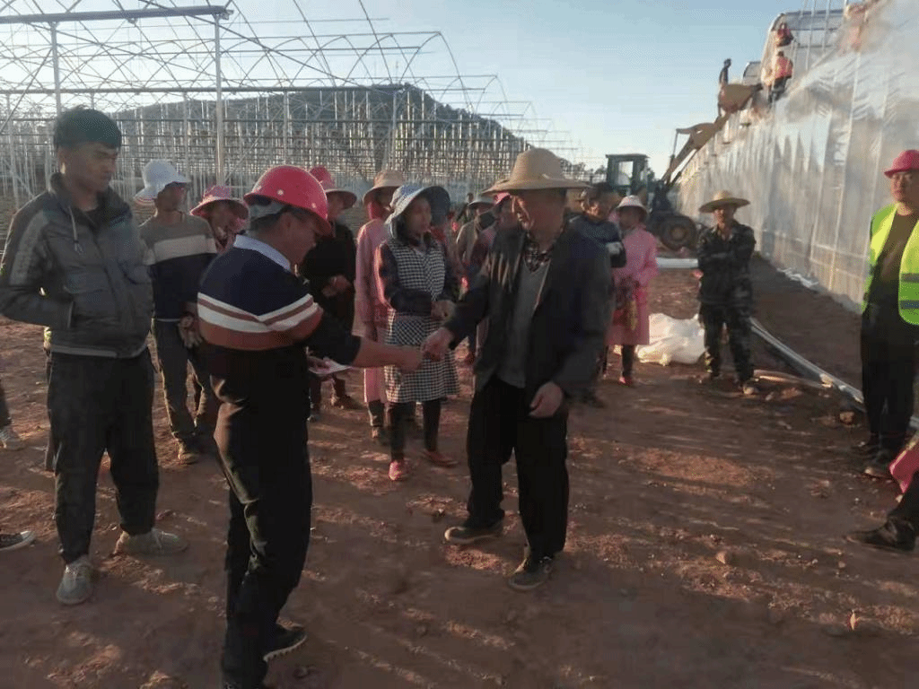 河硐村现代特色农业产业基地项目投资1500万元,由沪滇扶贫协作资金建设,工程于2021年9月份开工,建设占地80亩的玫瑰花种植温室大棚,配套建设2400平米的采后处理中心和加温中心。温室主体为大跨度轻钢联体结构,共两个棚,每拱跨度9.6米,顶高7.2米,温室设自动开窗卷膜系统,采用天然气热水机组加温配智能控温系统,建设无土栽培种植苗床3万米,建设水肥一体化自动灌溉系统,营养液回收循环利用系统,项目现已建设完工投产。项目自开工以来每天务工人数60人以上,极大地解决了脱贫村劳动力就业。