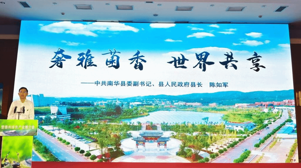 同时,陈如军重点推介了南华县食用菌、绿色食品、绿色制造、绿色能源、文化旅游五大绿色产业。在食用菌产业方面,他介绍:南华封山育菌面积达200多万亩,年交易量超过1万吨,是全国重要的野生菌产地和集散交易地。今年以来,南华出台了“菌保”“菌贷”和食用菌产业发展系列政策,全力构建食用菌种植加工全产业链,产业发展前景光明。在绿色制造产业方面,他介绍:南华县绿色制造园区、野生菌加工产业园区、绿色食品加工园区有可用土地近2000亩,生产要素一应俱全。此外,陈如军还指出,南华“天申堂萝卜”“五街洋芋”“礼舍江柑橘”“兔街茶叶”等高原特色农业产业基础好、发展势头强劲;南华丰姿多态的凤山湖、“镇南八景”之一——鹦鹉来青的鹦鹉山、天然自流的黑泥温泉,是优质的旅游资源;南华有可开发利用光伏土地资源9.5万亩、风电规划装机容量60万千瓦以上,同时还是滇西最大的产煤县,绿色煤炭资源储量达6800多万吨,开发前景非常广阔。