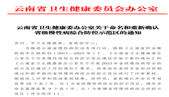 近日,从云南省卫健委办公室《关于命名和重新确认省级慢性病综合防控示范区的通知》中获悉,南华县确定并命名为省级慢性病综合防控示范区,标志着南华县省级慢性病综合防控示范区创建成功。