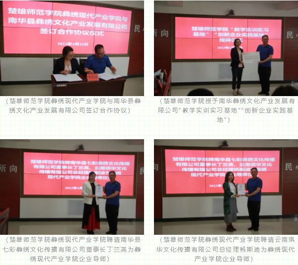 王连波同志及楚雄师范学院美术与艺术设计学院党总支副书记、院长王新春分别作了重要讲话。会上还举行了楚雄师范学院彝绣现代产业学院与南华县彝绣文化产业发展有限公司的合作签约仪式和“教学实训实习基地”“创新企业实践基地”授牌仪式。楚雄师范学院彝绣现代产业学院聘请了南华县七彩彝绣文化传播有限公司董事长丁兰英、云南琪华文化传播有限公司总经理杨斯迪为彝绣现代产业学院企业导师,南华七彩彝绣文化传播有限责任公司聘请了楚雄师范学院李正周教授为公司科技副总,云南琪华文化传播有限公司聘请了楚雄师范学院鲁玲老师为公司科技副总,这标志着楚雄师范学院与南华彝绣的合作翻开了崭新篇章。