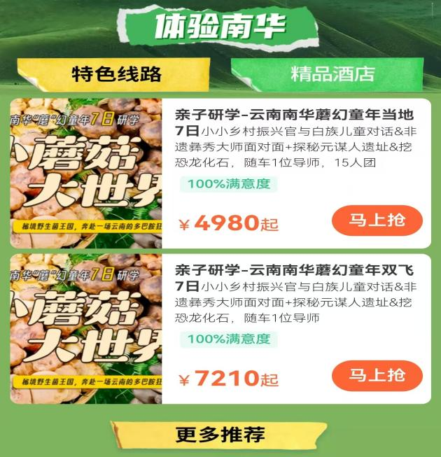 本次上线途牛旅游网南华品牌旗舰馆的旅游产品包括食菌知味、玩转南华、体验南华和链接南华四个版块,涵盖了南华县内各热门景区景点和精品酒店,同时还发布了两条亲子研学7日游旅游线路产品,动动手指即可了解南华旅游资源。