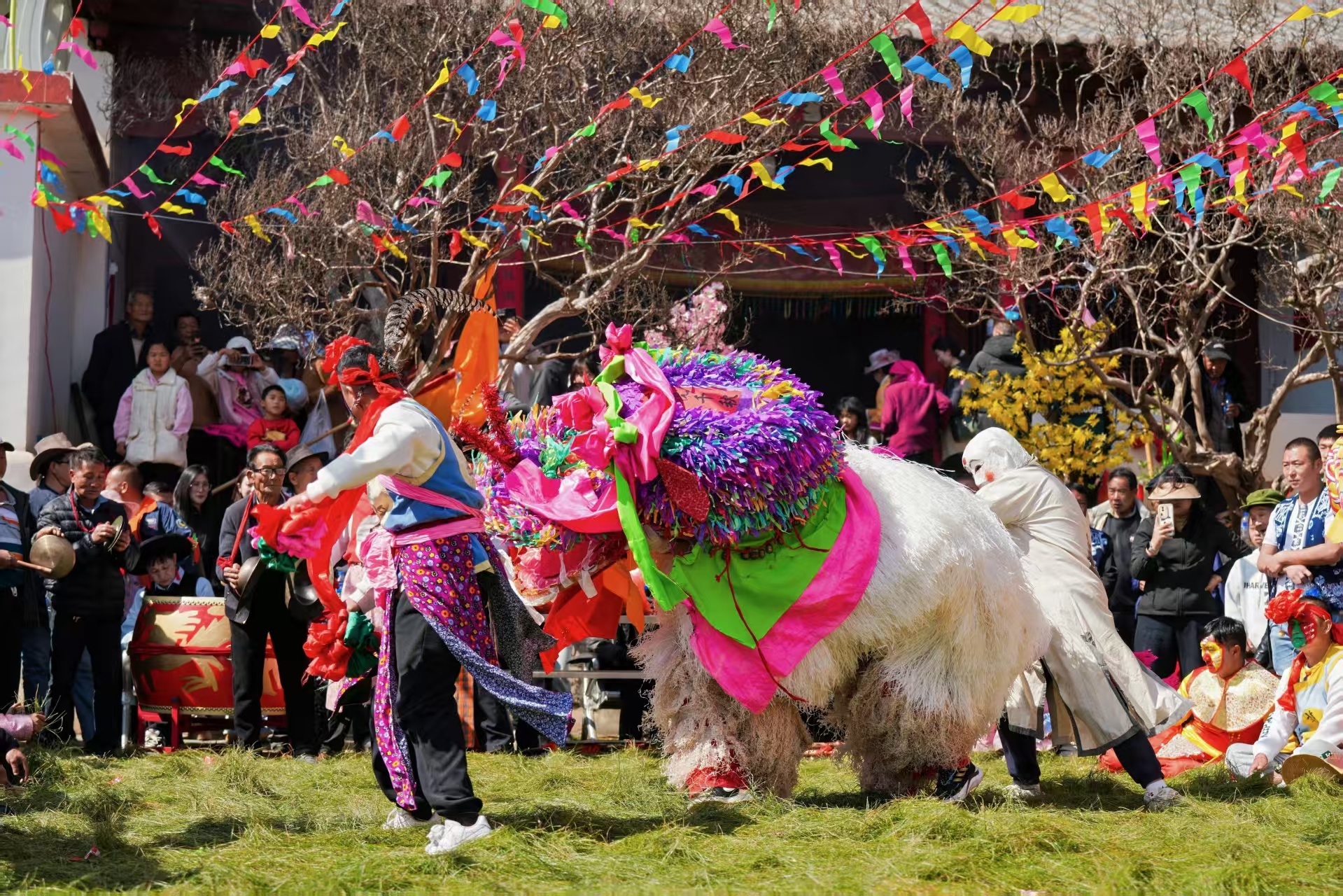 与此同时,南华县的大三弦打跳和陀螺比赛也成为节日的亮点。在马街镇,村民们手持大三弦,围成圆圈或排成长队,跟随大三弦的节奏边弹边跳。通过这种方式,传承弘扬本民族文化,增强民族凝聚力和认同感。而陀螺比赛更是热闹非凡,各村小组之间展开激烈角逐,现场欢声雷动。