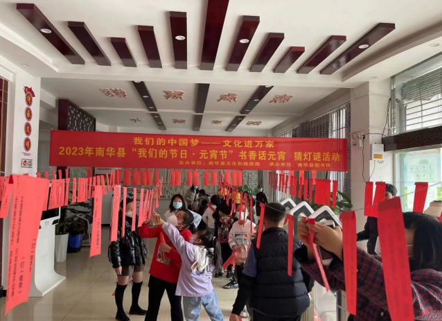 2月5日下午,在南华县图书馆举办了“书香话元宵·猜灯谜”活动,活动共悬挂灯谜500余条,谜题涵盖了党的二十大精神、社会主义核心价值观、成语故事、传统民俗、历史人物、百科知识等,内容既贴近生活,又充满文化色彩,既具娱乐性,又具知识性,幽默风趣又十分应景。活动现场,有的仰头读题,有的低头沉思,有的猜中答案手舞足蹈,欢欢喜喜地领取了小礼品。猜灯谜不仅领略了传统文化的魅力,也使自己的智慧得到启迪,现场洋溢着欢乐、祥和、喜庆的气氛。