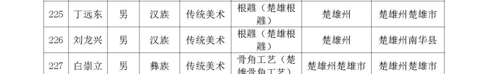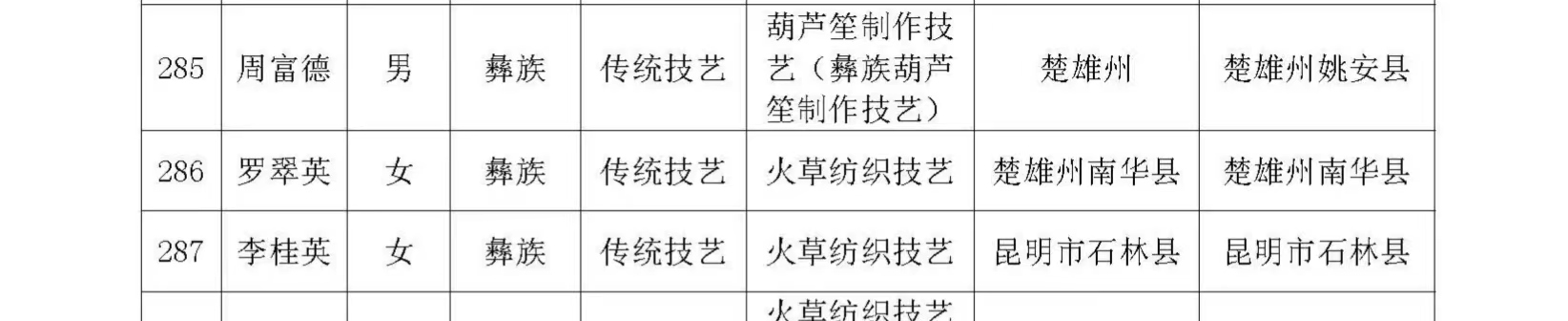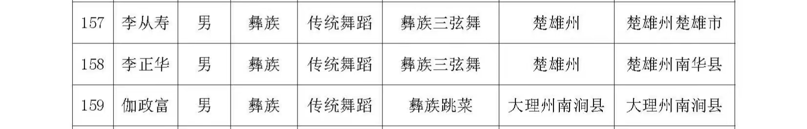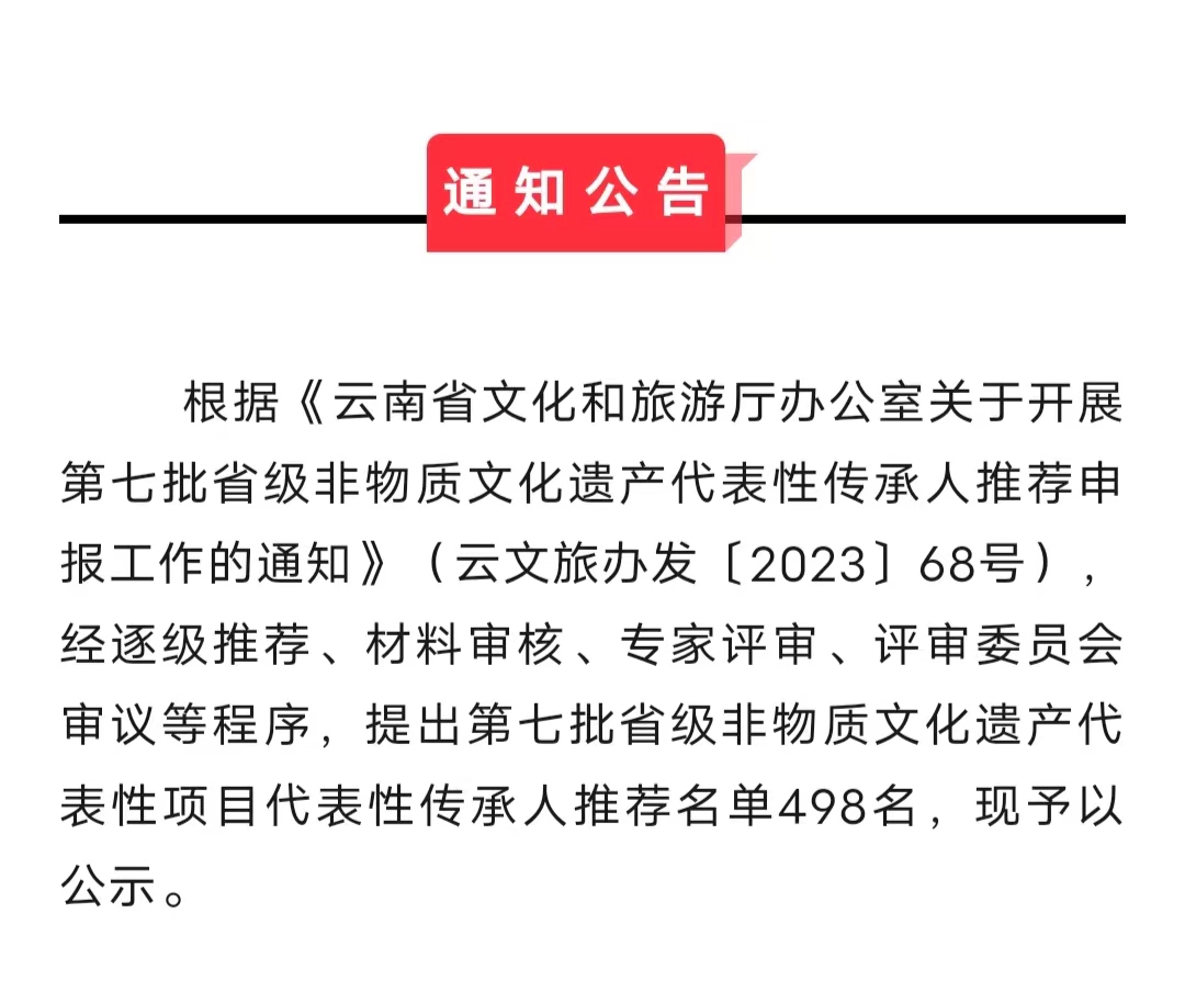 近日,云南省文化和旅游厅发布《云南省文化和旅游厅办公室关于开展第七批省级非物质文化遗产代表性传承人推荐申报工作的通知》(云文旅办发〔2023〕68号),南华县共有6名传承人拟入选,分别是南华沙街调传承人高菊英、彝族三弦舞传承人李正华、根雕(楚雄)技艺传承人刘龙兴、火草纺织技艺传承人罗翠英、彝族三弦制作技艺传承人周建荣、雨露白族正月灯会传承人苏国顺。