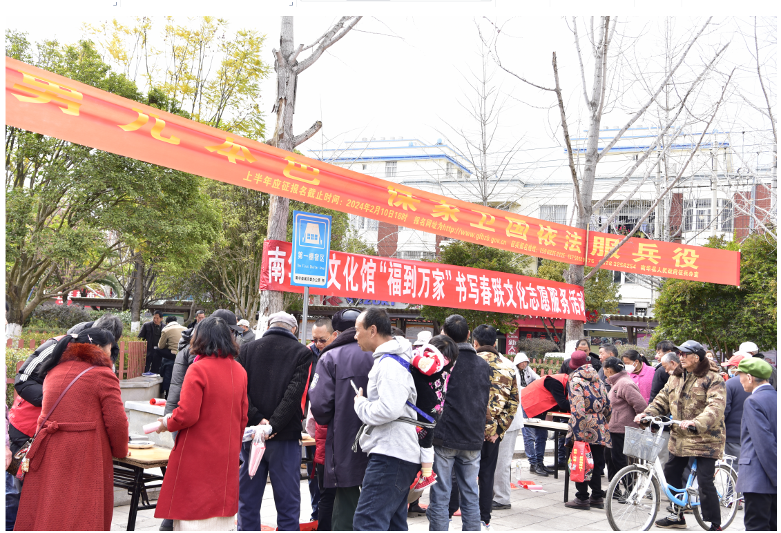 “千禧龙年歌盛世,万家灯火庆新春”。为传承中华优秀传统文化,丰富群众的精神文化生活,营造欢乐祥和的节日氛围。2024年1月21日南华县文化馆“春联送福迎新春”文化志愿服务活动在龙泉广场举行。