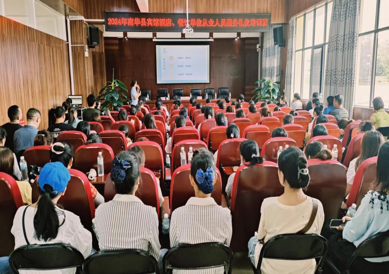 为进一步提高全县宾馆酒店、餐饮单位从业人员服务水平,强化服务意识,规范服务标准,有效推进我县宾馆住宿餐饮行业持续健康发展。2024年6月19日,县文化和旅游局在南华县图书馆4楼举办全县宾馆酒店餐饮单位从业人员服务礼仪培训班,全县宾馆酒店餐饮经营企业从业人员110余人参加了学习培训。